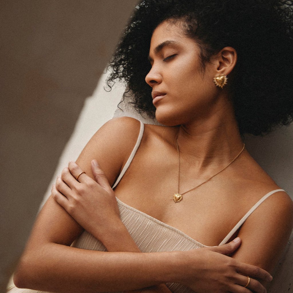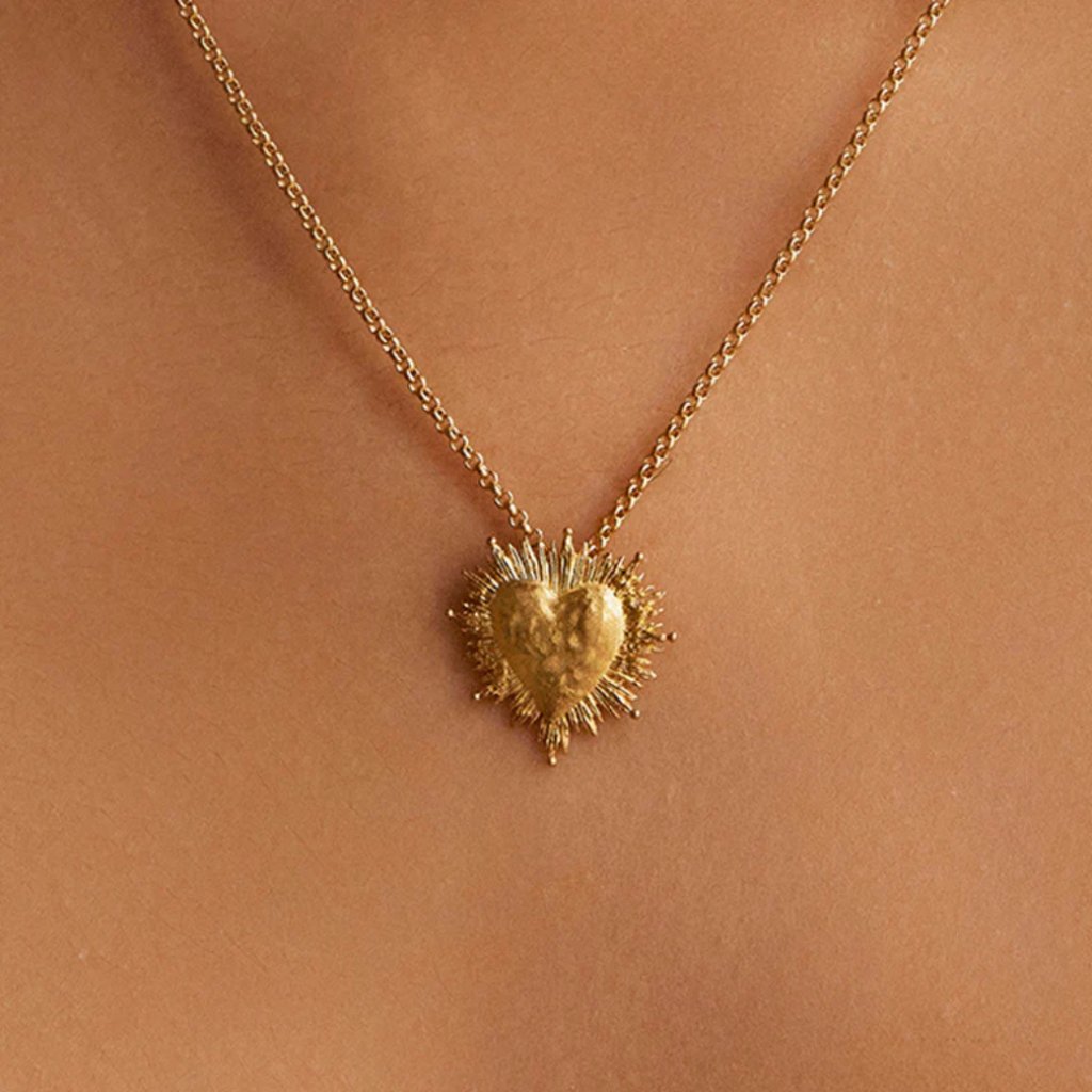 Zářivý náhrdelník s přívěskem ve tvaru srdce, inspirovaný posvátnou mexickou ikonografií a ex-voty. Dominantou je tepané srdce doplněné o detailní motiv sluneční záře.