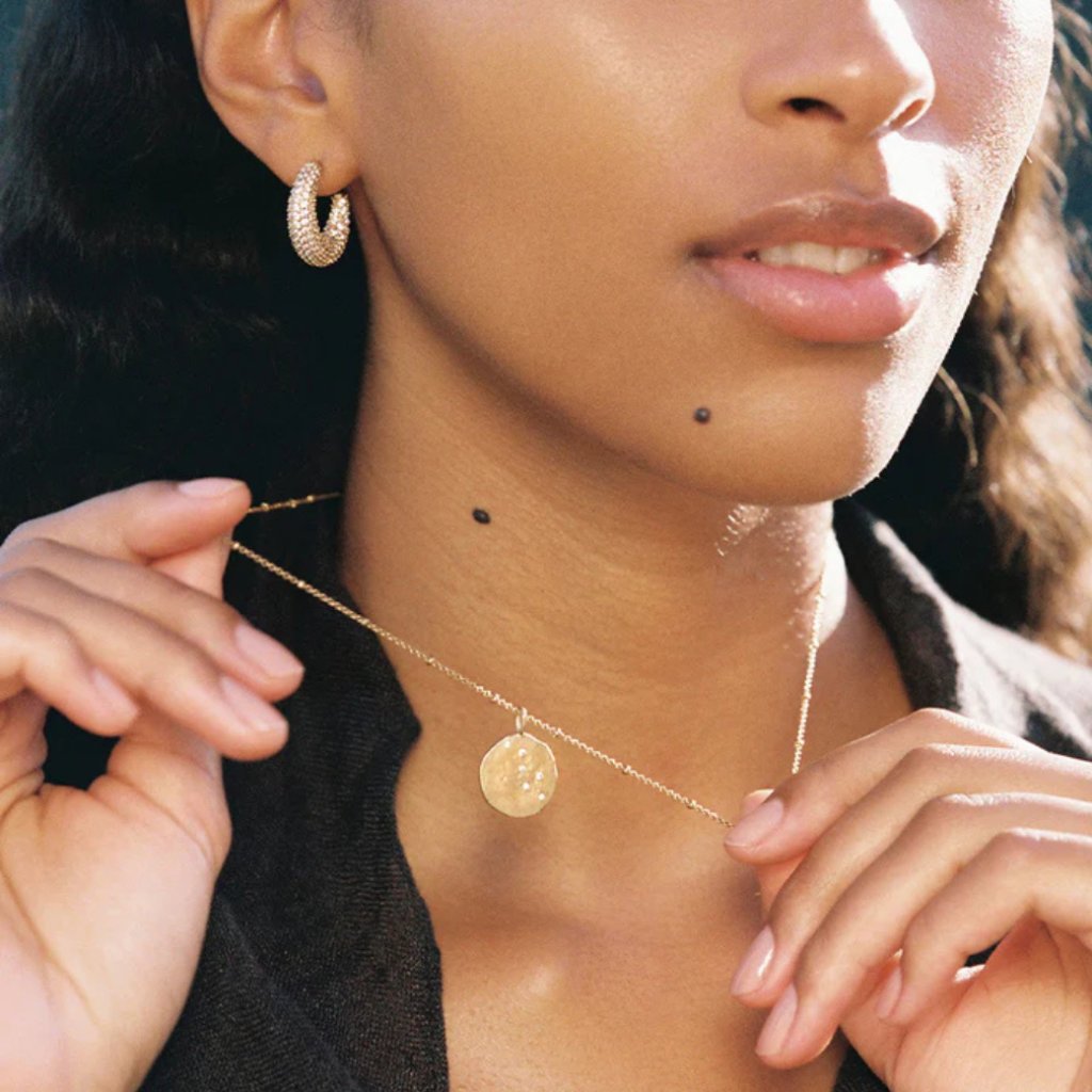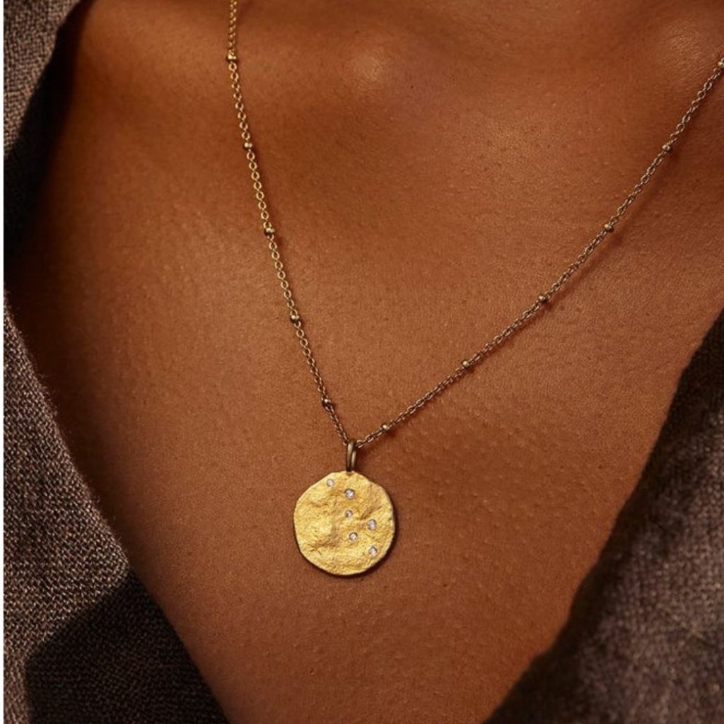 Zlatý přívěsek Lumoria ve tvaru kulatého disku připomíná vzácnou starověkou minci. Jeho povrch zdobí jemné bílé kamínky, které se třpytí jako hvězdy na noční obloze. Elegantní šperk, který se hodí ke každé příležitosti – decentní, a přitom nepřehlédnutelný.