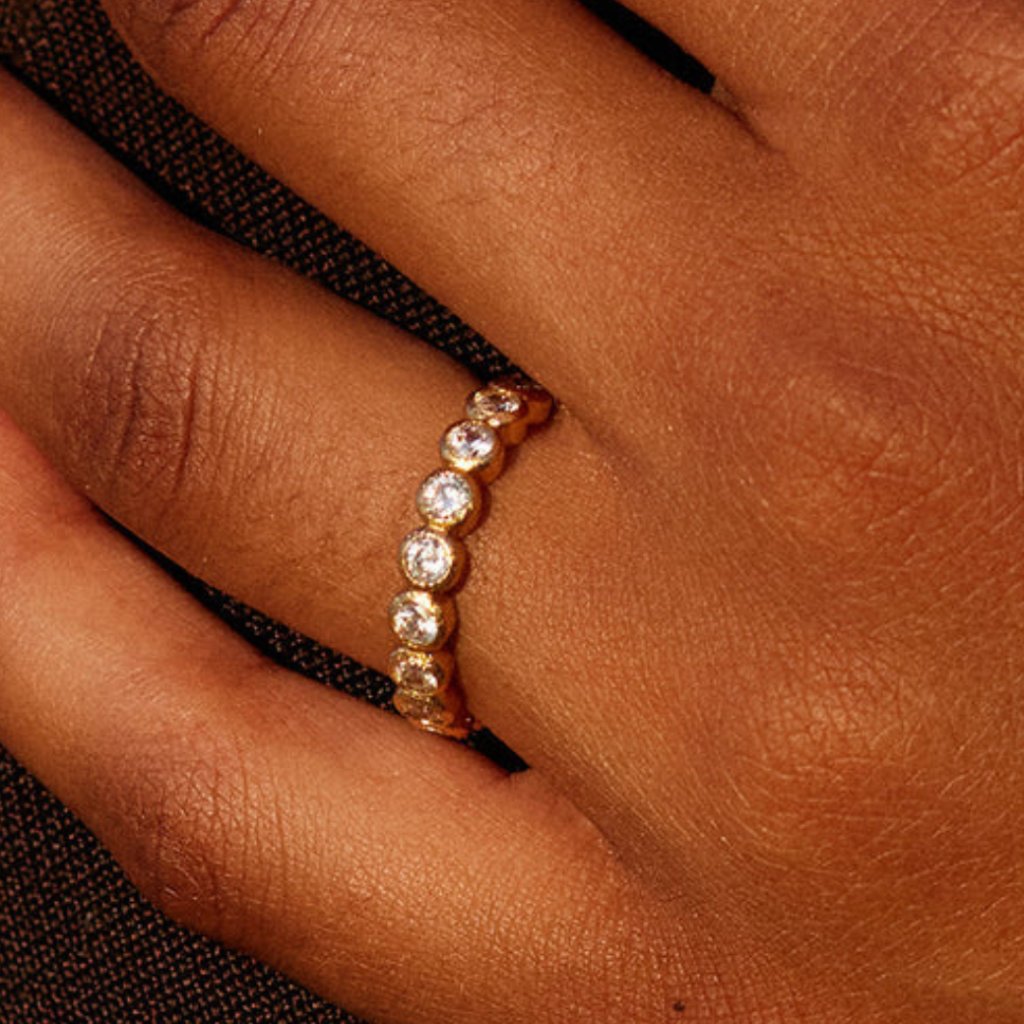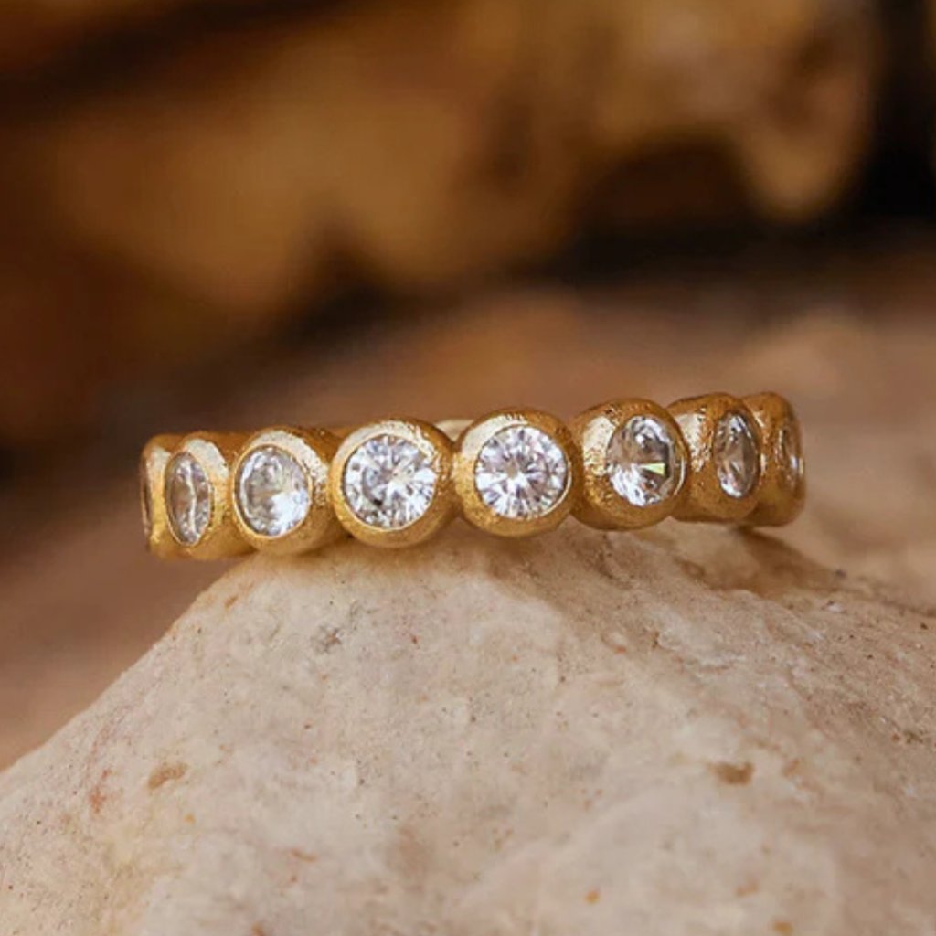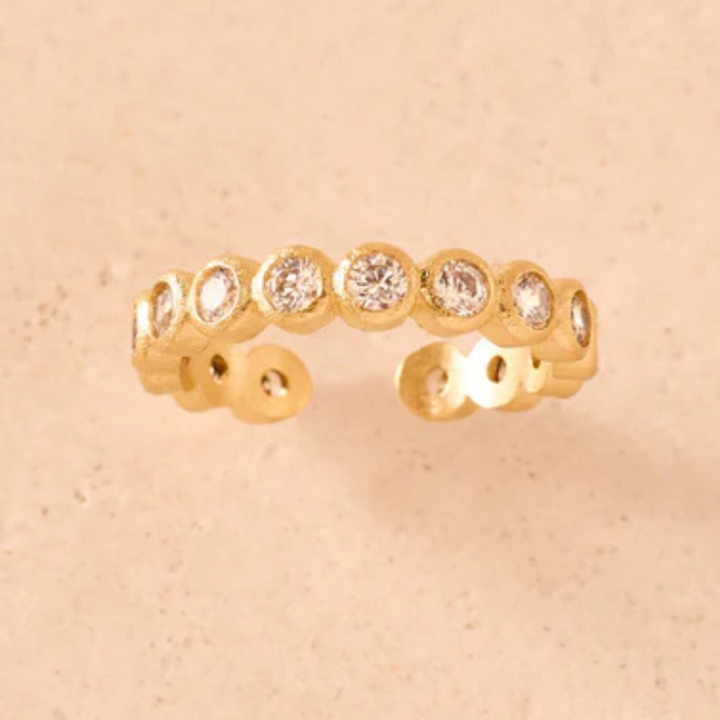 Zářivý a elegantní prsten s jemně geometrickým designem, posázený čirými zirkony, které se třpytí při každém pohybu. Zlatý základ se saténovou úpravou působí luxusně, ale zároveň decentně – ideální doplněk pro každý den i výjimečné příležitosti.