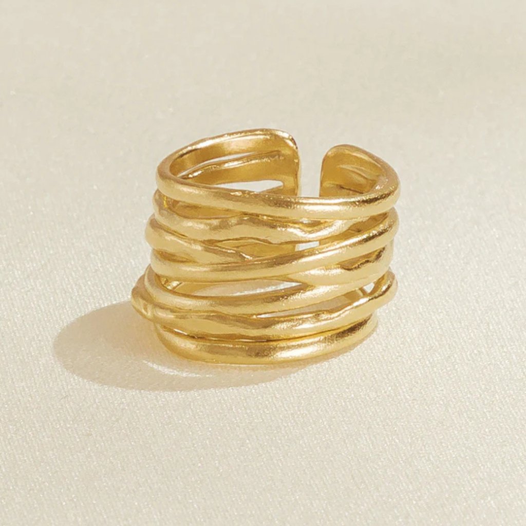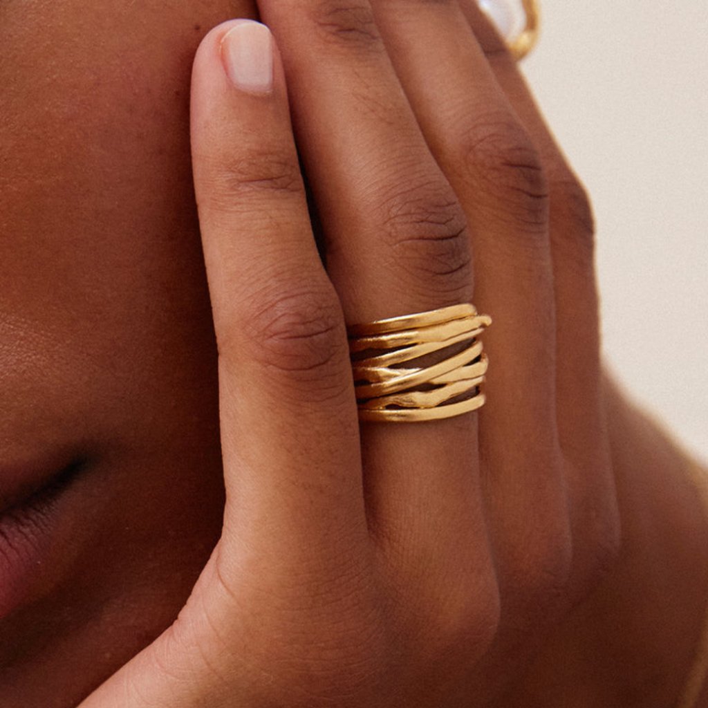Jemný prsten s otevřenou konstrukcí, tvořený sedmi nepravidelně propletenými řadami, které jemně zachycují světlo. Přednastavený pro snadné vrstvení a výraznou eleganci.