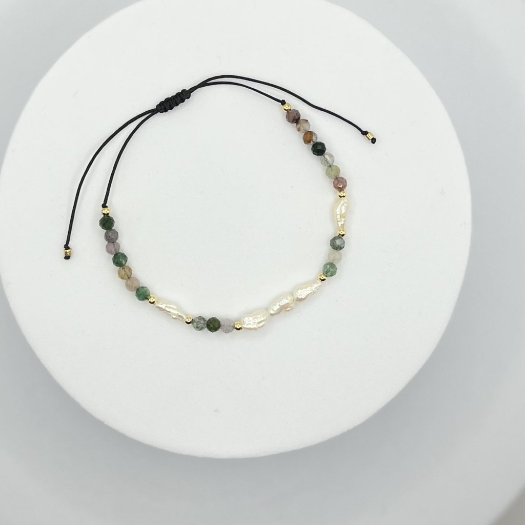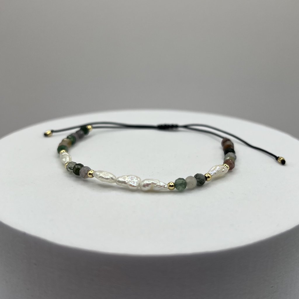 Jemný náramek s říčními perličkami, zlatými nerezovými korálky a achátem.