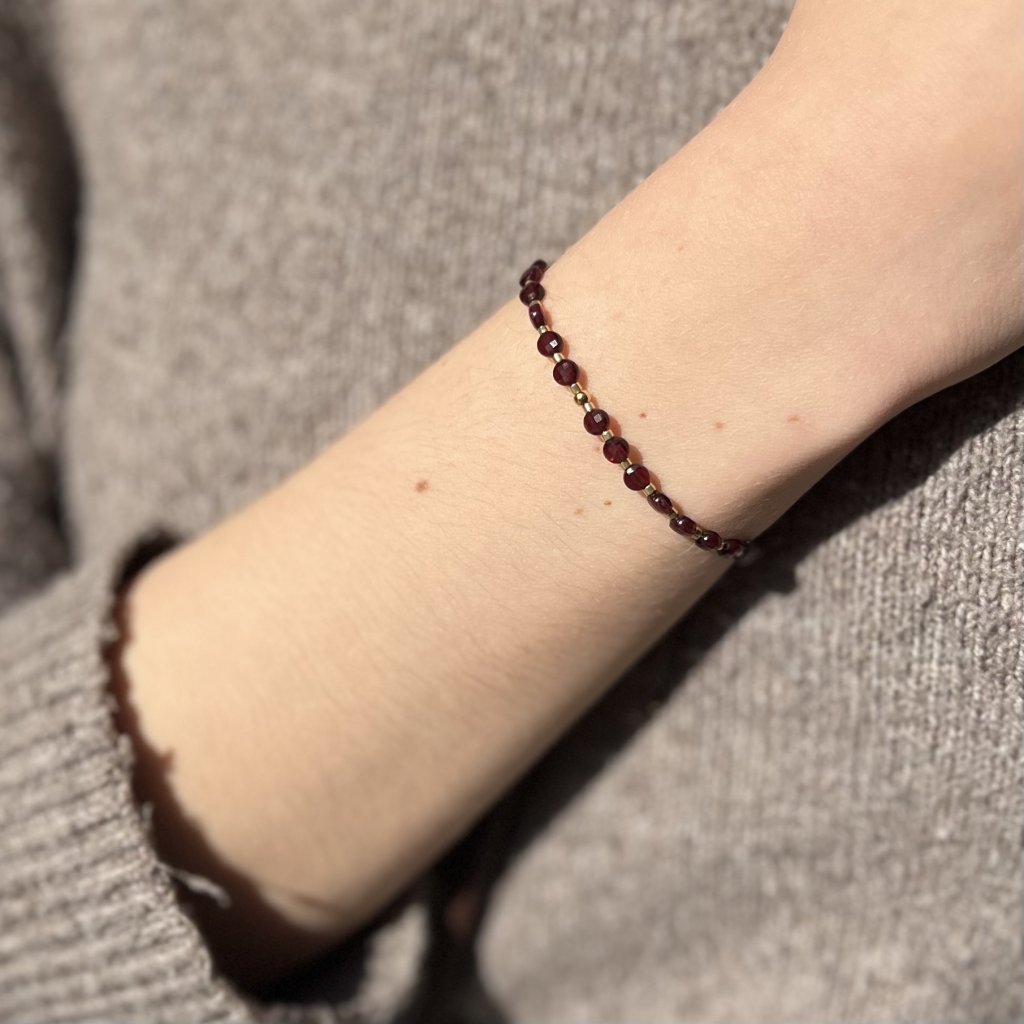 Materiál: rokajové zlaté korálky, granát, černá nylonová šňůrka, stříbrný korálek pozlaceným 24K zlatem
