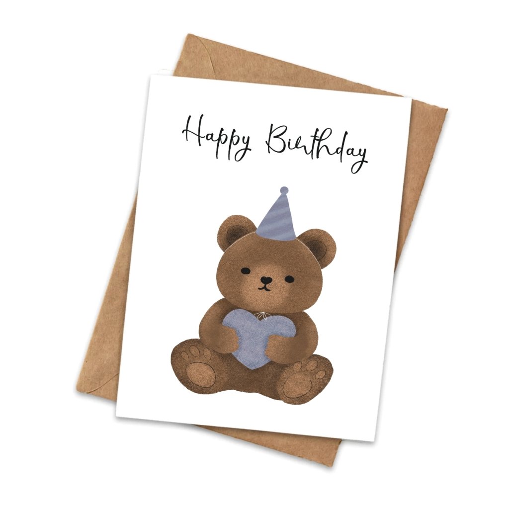 Roztomilý medvídek se srdcem, narozeninovou čepičkou a nápisem Happy Birthday.