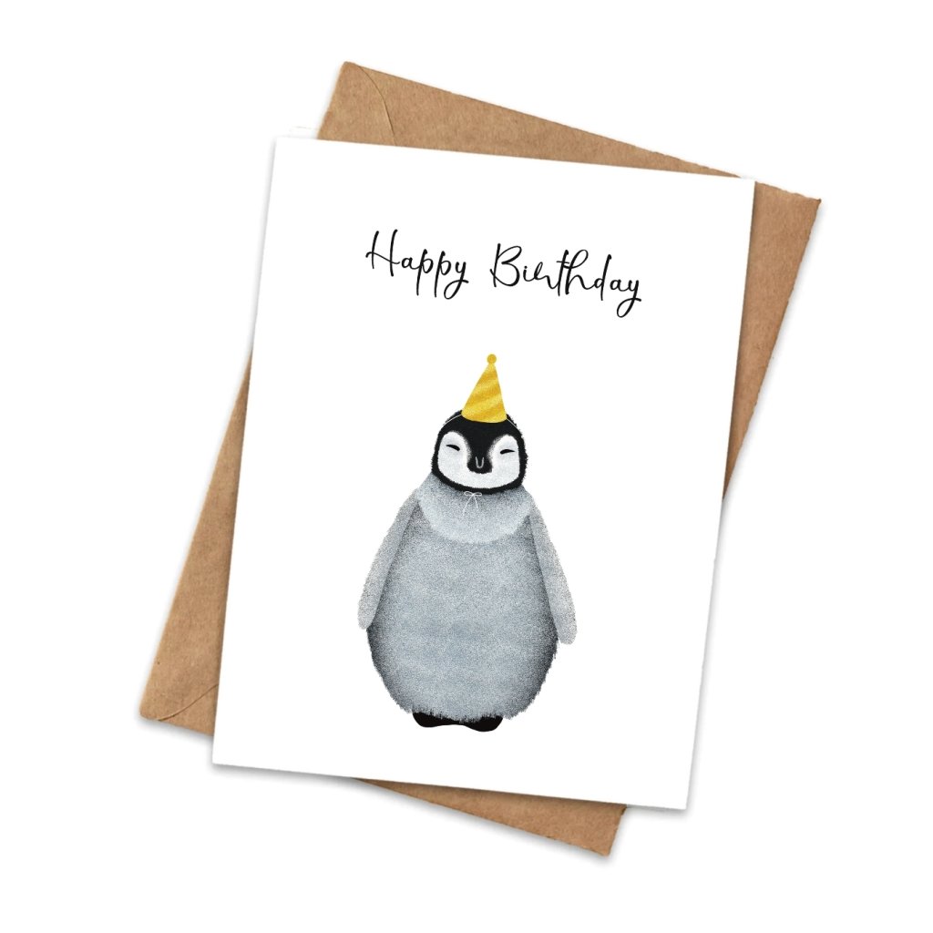 Roztomilé přání s motivem tučňáka potěší jemnou ilustrací i prostorem pro osobní vzkaz. Hodí se k narozeninám, poděkování i jen tak – pro radost.