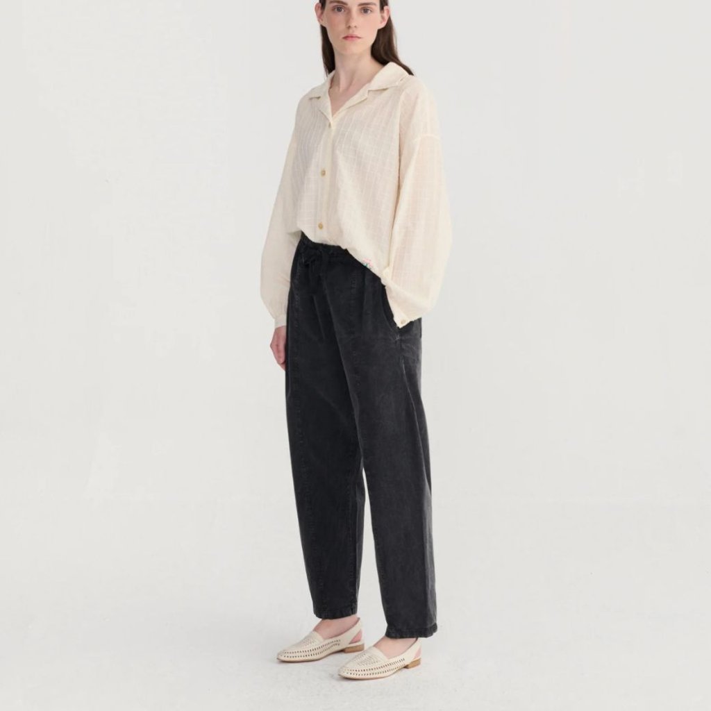 Stylové tmavě šedé melírované kalhoty s moderním, uvolněným střihem typu slouchy/cocoon. Navrženy s zkrácenou délkou a středně vysokým pasem, který lichotí postavě a zároveň je pohodlný na každodenní nošení.