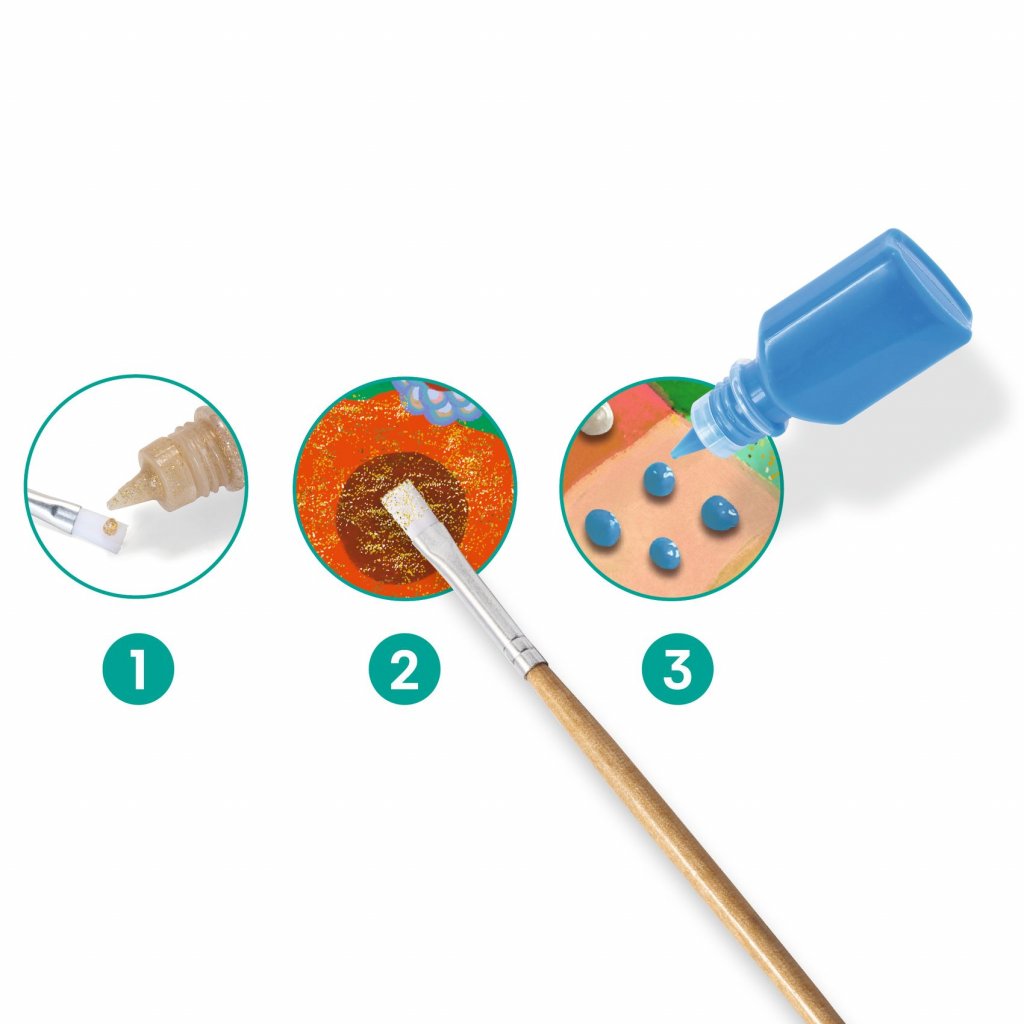 Obsah: 4 ilustrované desky k dokončení (21 x 28 cm), 8 perleťových barev, 1 štětec a 1 barevná brožurka s pokyny krok za krokem.