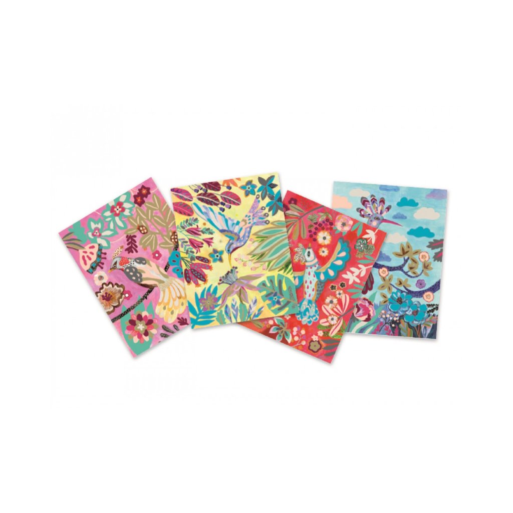 Kreativní sada DJECO Barevní ptáci vtáhne děti do kouzelného světa přírody. Pomocí vodových barev a štětce si vybarví čtyři ilustrace s exotickými ptáčky, které pak mohou zarámovat a vystavit ve svém pokoji. Malování se tak stává nejen hrou, ale i originální výzdobou.