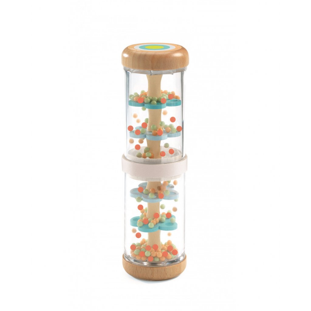 Chrastítko Piti rain duhové je dřevěná hračka pro nejmenší děti od 12 měsíců. Barevné kuličky propadávají přes otvory v plastové trubici a vydávají zvuk připomínající déšť. Děti při hře pozorují pohyb kuliček, rozvíjejí jemnou motoriku a zároveň si procvičují koncentraci.