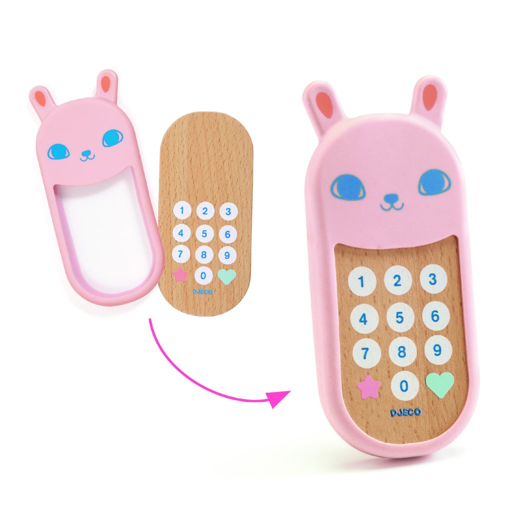1 vyšívaná látková kabelka: 1 telefon s pouzdrem na králíka, 1 svazek 3 klíčů a 1 dřevěné hodinky.