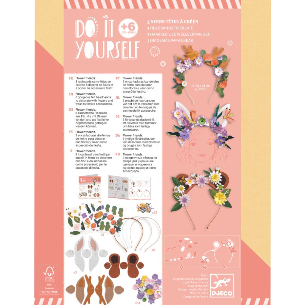 Obsah: 16 předseknutých samolepicích plstěných dílků, 3 stužkové čelenky, 50 reliéfních papírových květinových hlaviček (různé vzory a barvy), 4 archy předseknutých květinových ozdob, 32 barevných sponek, 1 podrobný návod. Velikost čelenek 23 x 23cm.