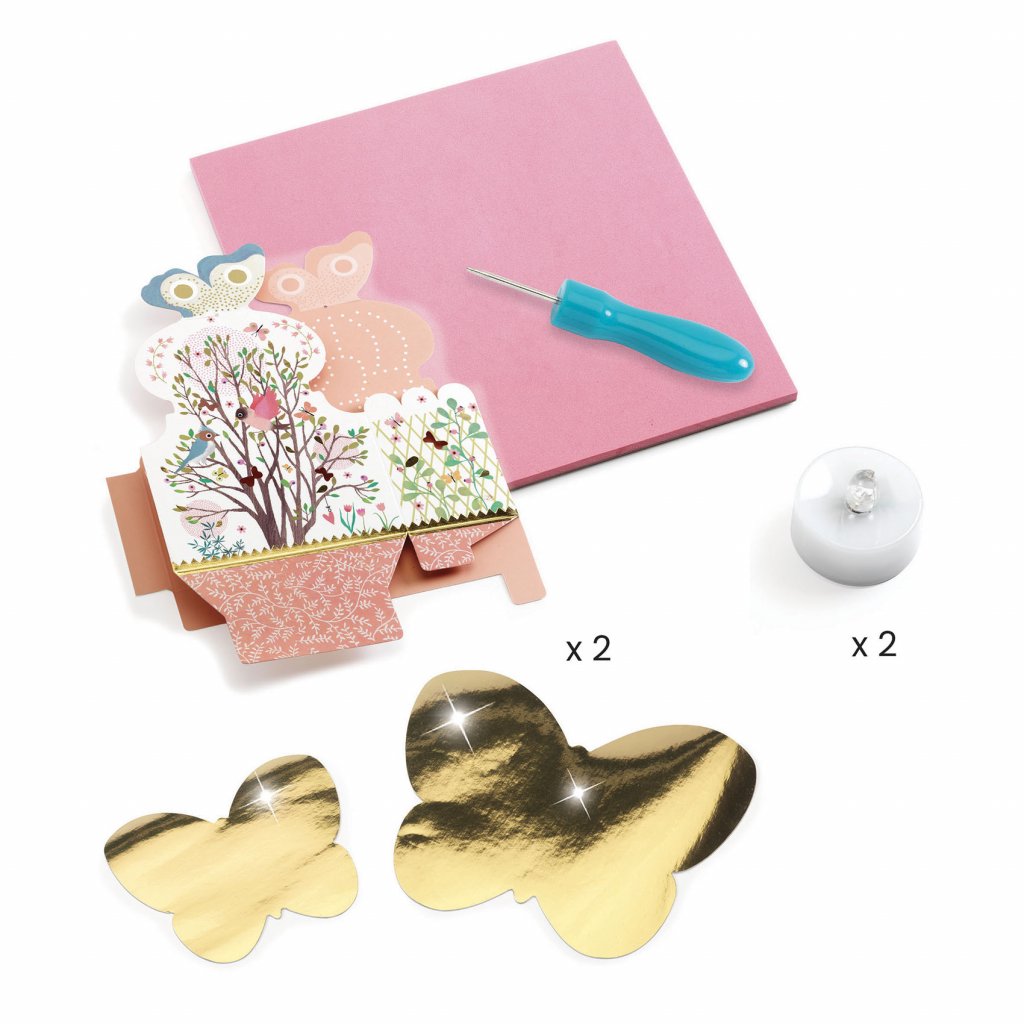DIY sada Djeco Noční lampionky umožní dětem vyrobit si dvě kouzelné lucerničky, které se stanou nejen krásnou dekorací, ale i uklidňujícím světýlkem před spaním. LED svíčky vydávají jemné, tlumené světlo a po 30 minutách se samy vypnou, takže poslouží i jako ideální světlo k usínání. Tvoření lampionků rozvíjí kreativitu a zároveň přináší radost z vlastního výtvoru, který dětem zútulní jejich pokoj.
