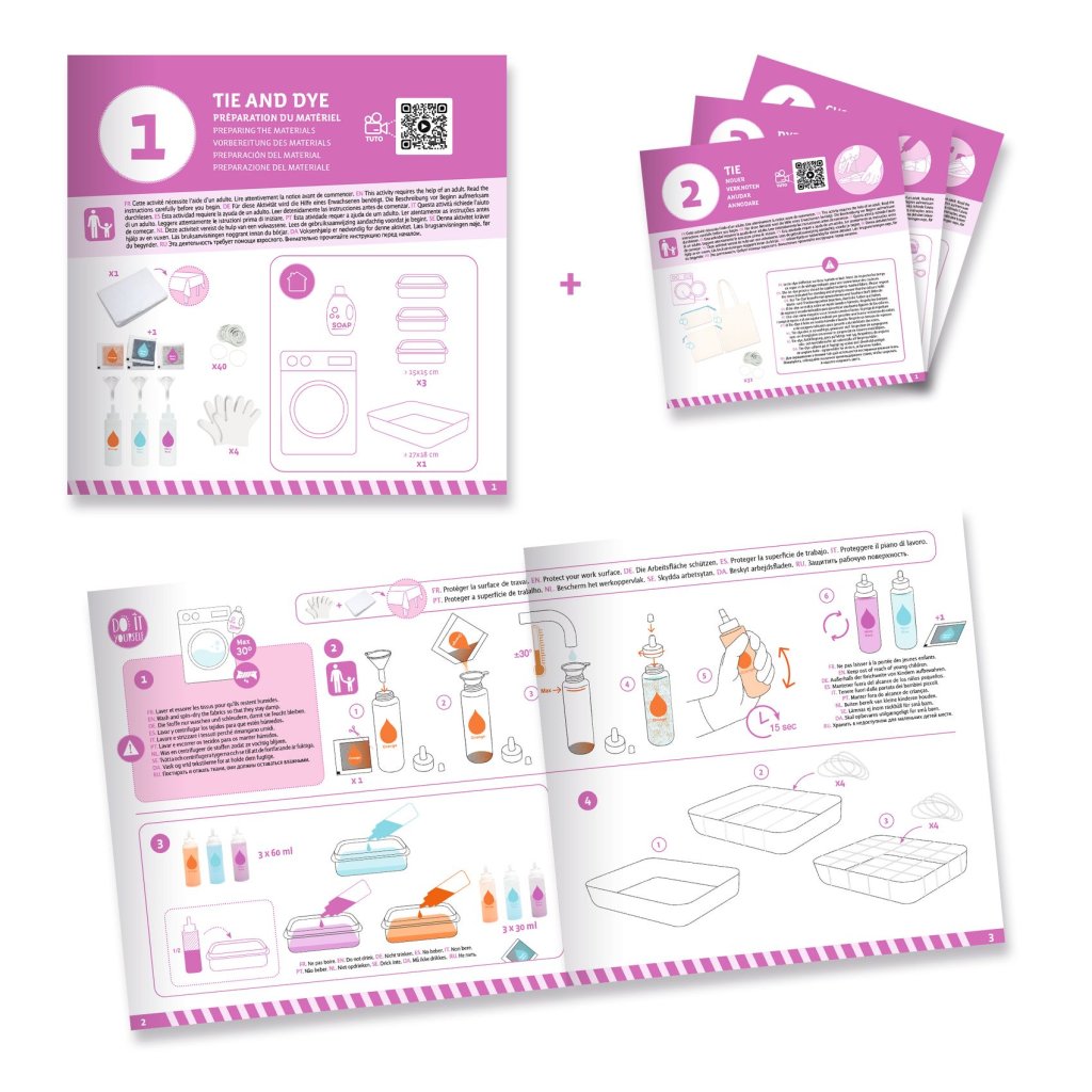 3 bavlněné doplňky (1 taštička, 1 kapsička a 1 penál), 3 práškové barvy, 3 x lahvičky 60 ml, 40 gumiček, 9 nažehlovacích textilních záplat, 1 ubrus, 3 (+1) páry rukavic, 1 sada podrobných instrukcí vysvětlujících 3 techniky vytváření vzorů kravaty.