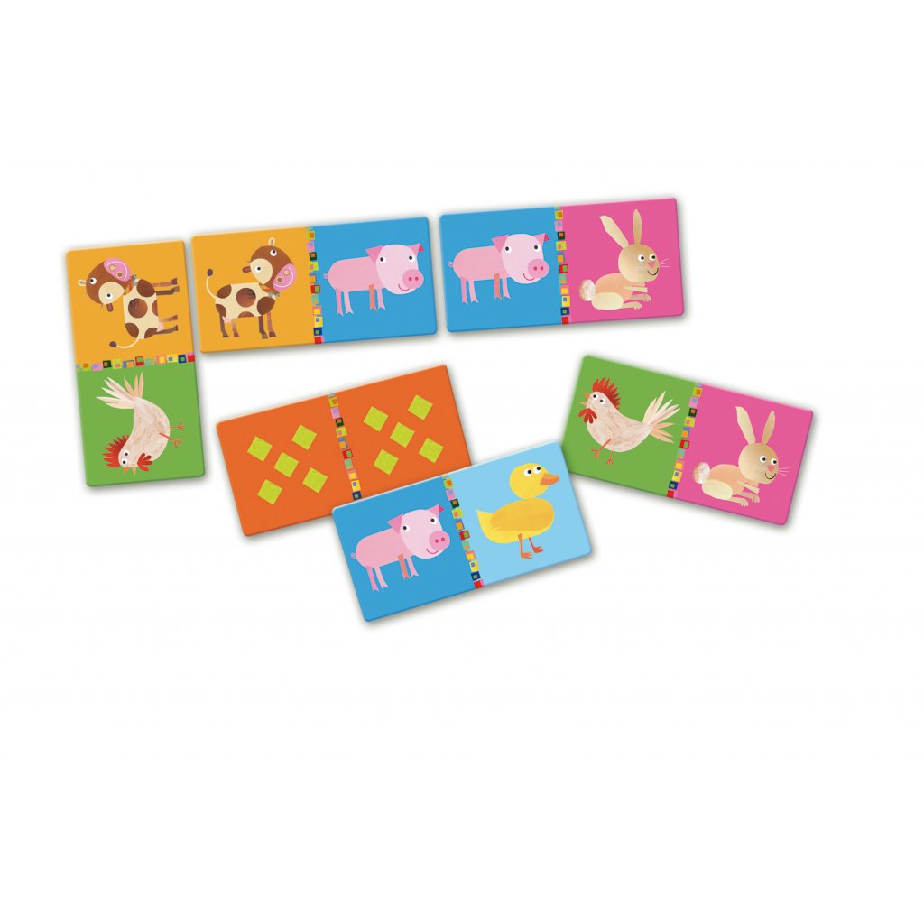 Domino Djeco Farma je ideální hra pro děti od 3 let, které se při skládání učí poznávat jednotlivá domácí zvířátka a procvičují logické myšlení i trpělivost. Kartičky se postupně přikládají k sobě, až vznikne dlouhý řetěz veselých obrázků. Díky pevnému kartonovému zpracování vydrží i časté hraní a hravé ilustrace zvířátek navíc potěší na první pohled.