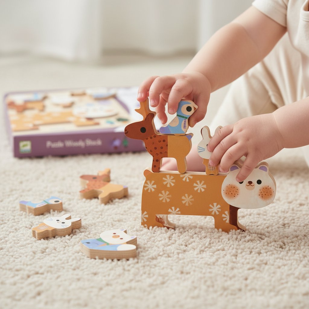 WoodyStack je krásně zpracované dřevěné puzzle, které spojuje skládání s hraním. Děti nejprve vloží zvířátka do správných otvorů a poté si s nimi mohou hrát samostatně – figurky totiž stojí a dají se stavět na sebe do veselých pyramid. Hra rozvíjí jemnou motoriku, koordinaci ruka–oko i představivost.