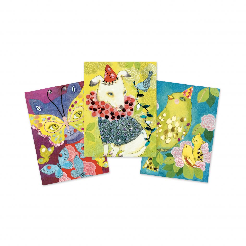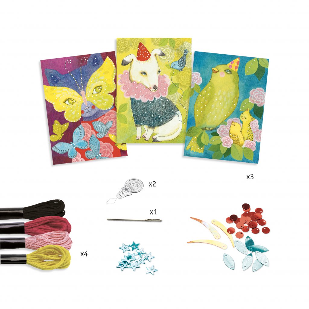 Set obsahuje tři předlohy na tvrdém kartonu s proděravěnými obrázky, jehlu, barevné bavlnky a spoustu flitrů. Děti pomocí přiložených bavlnek a flitrů obrázky dotvoří. Mohou dle vlastní fantazie nebo podle přiloženého návodu, který je navede krok po kroku.