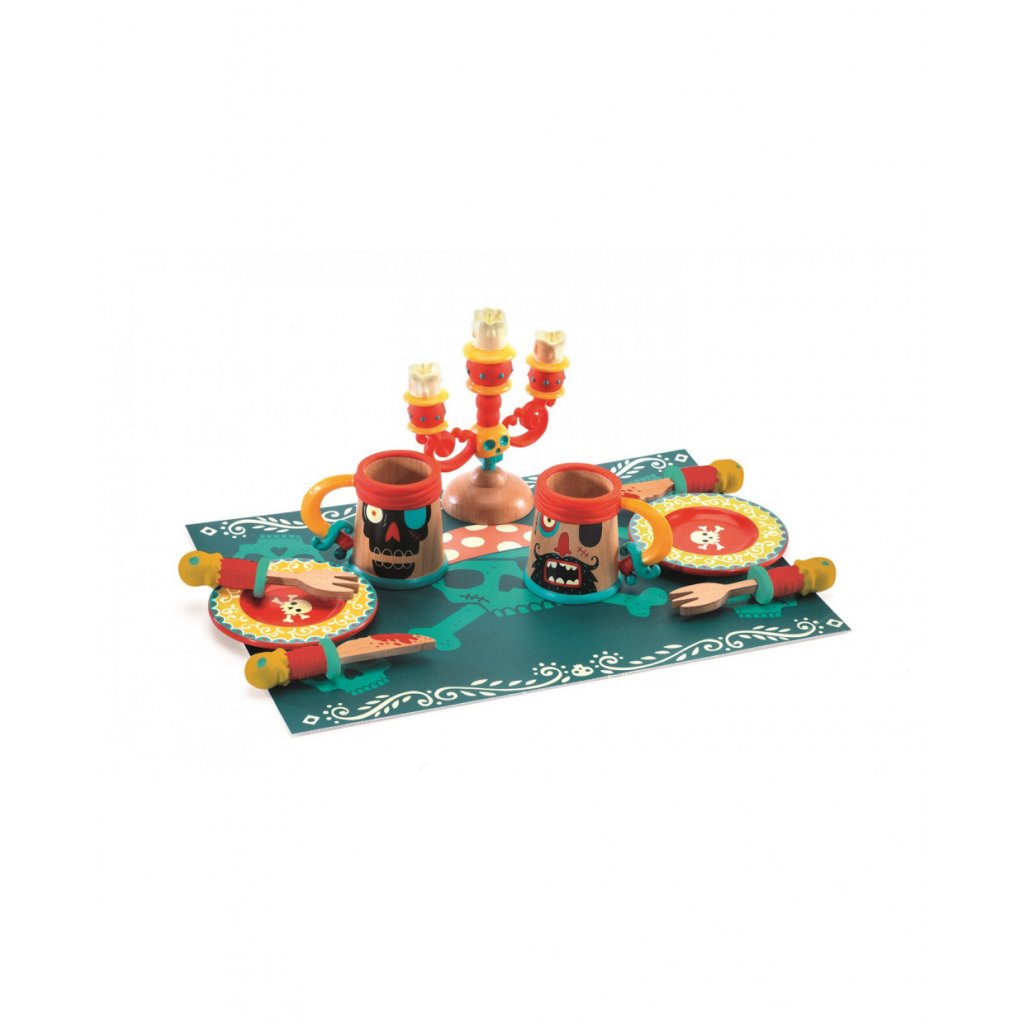 Pestrobarevná dřevěná souprava od Djeco přenese děti do světa pirátů a dobrodružných oslav. Obsahuje talířky, příbory, korbele na lahodný mok a svícen s dekoracemi pirátů – to vše na barevné podložce. Hračka podporuje fantazii, kreativitu a hraní rolí. Vhodná pro děti od 3 let.