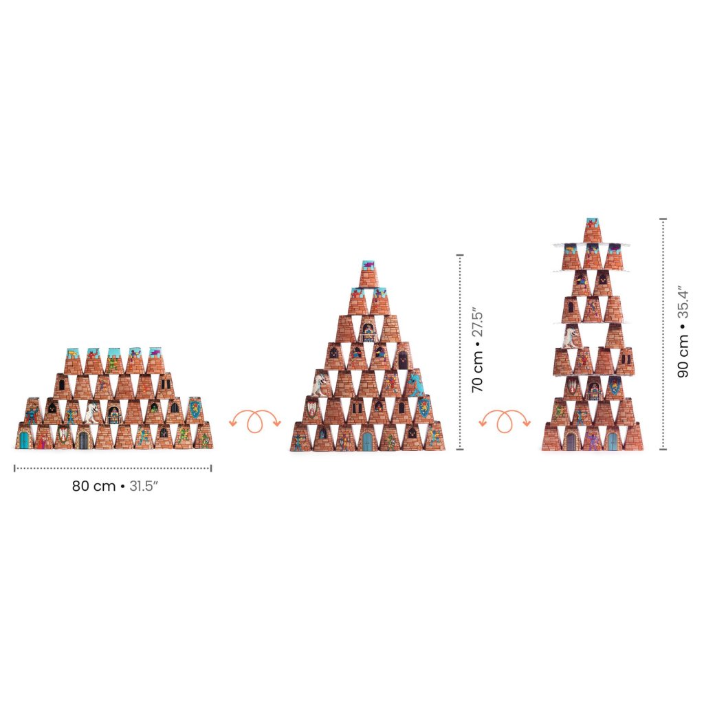 Stavební hra: 30 kuželů a 4 desky ke skládání a vytváření desítek kombinací hradů, od nejvyšších až po ty nejúžasnější možné, jak rozšiřujete své limity jako stavitel. Pak budete mít 3 šance, jak to všechno srazit a začít znovu.