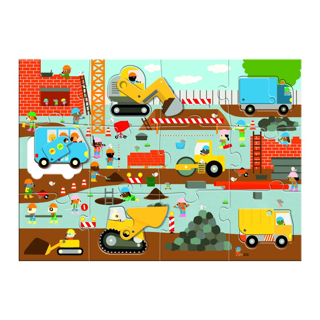 Staveniště, které ožívá pod dětskýma rukama! Velké podlahové puzzle se 12 extra velkými dílky zavede děti přímo na rušné staveniště. Nejde ale jen o skládání – součástí jsou i pohyblivá vozidla (bagr, autobus, náklaďák a další), která děti zasazují na správná místa a mohou si s nimi hrát. Puzzle tak propojuje logické uvažování s fantazií a jemnou motorikou. Ideální pro malé stavitele od 3 let!