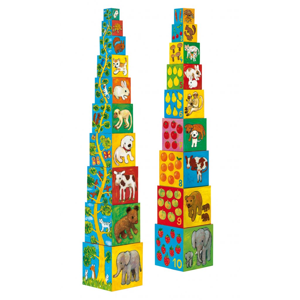 Postavte si vysokánskou věž s krásnými ilustracemi! Děti si užijí stavění i boření krabiček a přitom se učí poznávat barvy, tvary, zvířátka a první počty.