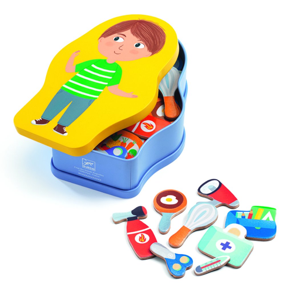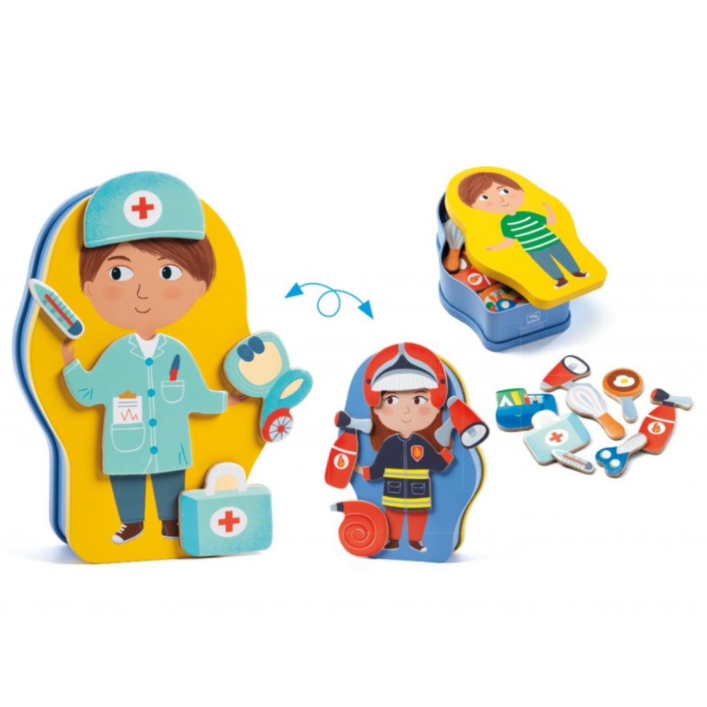 Děti si mohou skládat různé profese a jejich doplňky přímo na plechovou krabičku, která slouží jako herní plocha. Díky 20 dílkům vznikají stále nové variace povolání a nekonečné příběhy, které rozvíjí fantazii a kreativitu. Po hře se vše snadno uklidí zpět do krabičky, kterou si děti mohou vzít kamkoliv s sebou.