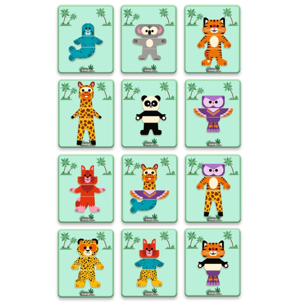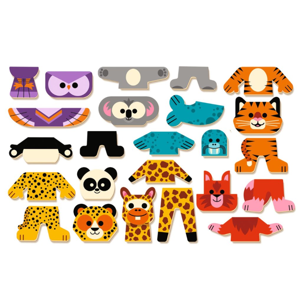 Děti skládají dřevěné magnetky na tenkou kovovou krabičku a podle předloh vytvářejí 8 různých zvířátek – nebo si s radostí „popletou“ části těl a vytvoří ty nejvtipnější kombinace. Každá strana krabičky má jiný obrázek, takže nabízí dvě herní prostředí a ještě víc možností hry. Všechny magnetky se po skončení jednoduše uloží dovnitř, což z této sady dělá ideální hračku na cesty.