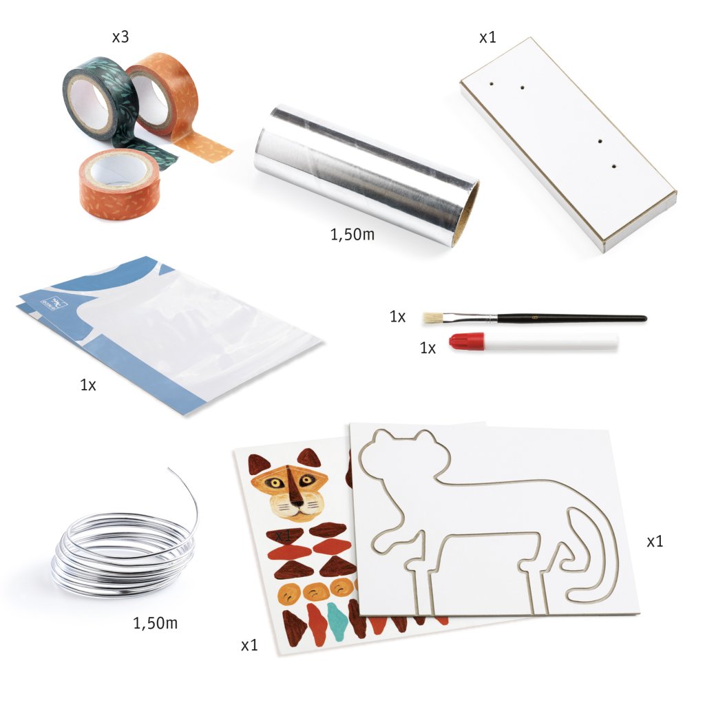 Modelářský set Tygr od Djeco je kreativní sada pro děti, které si chtějí vyzkoušet, jak vzniká socha. Pomocí drátku, alobalu, barevných pásek a samolepek si sestaví vlastní postavičku tygra. Díky přiloženým pomůckám a podložce je tvoření snadné a zábavné. Výsledkem je originální figurka, kterou si děti samy vyrobí od začátku do konce.