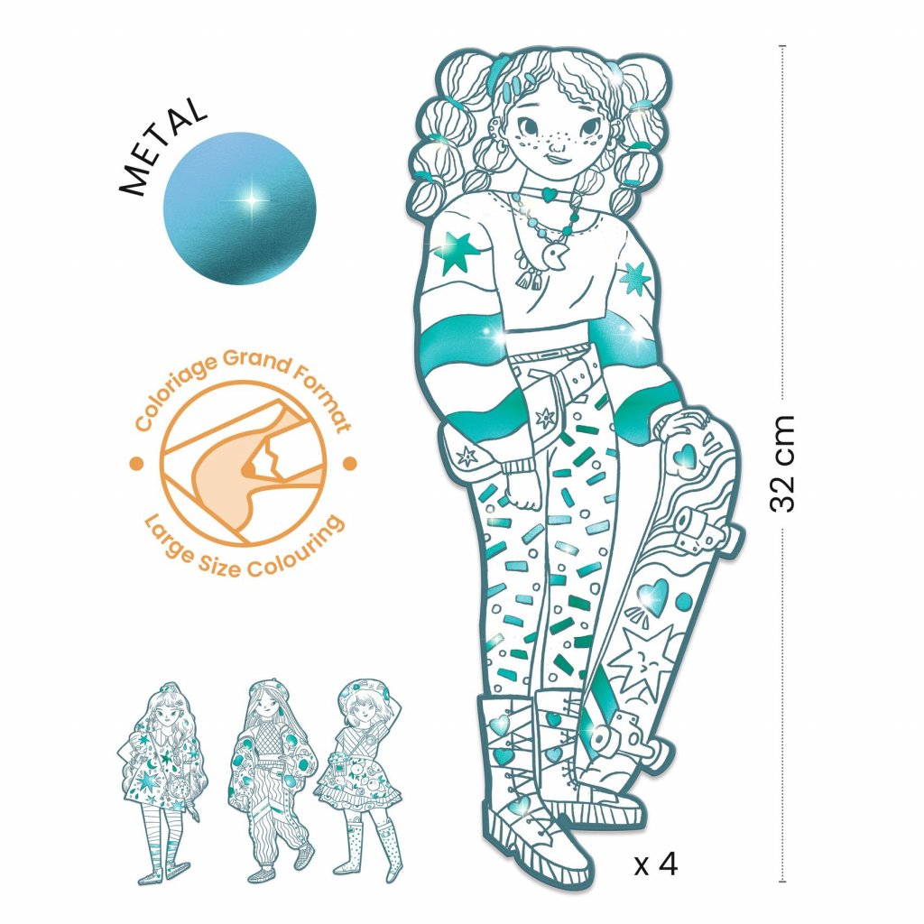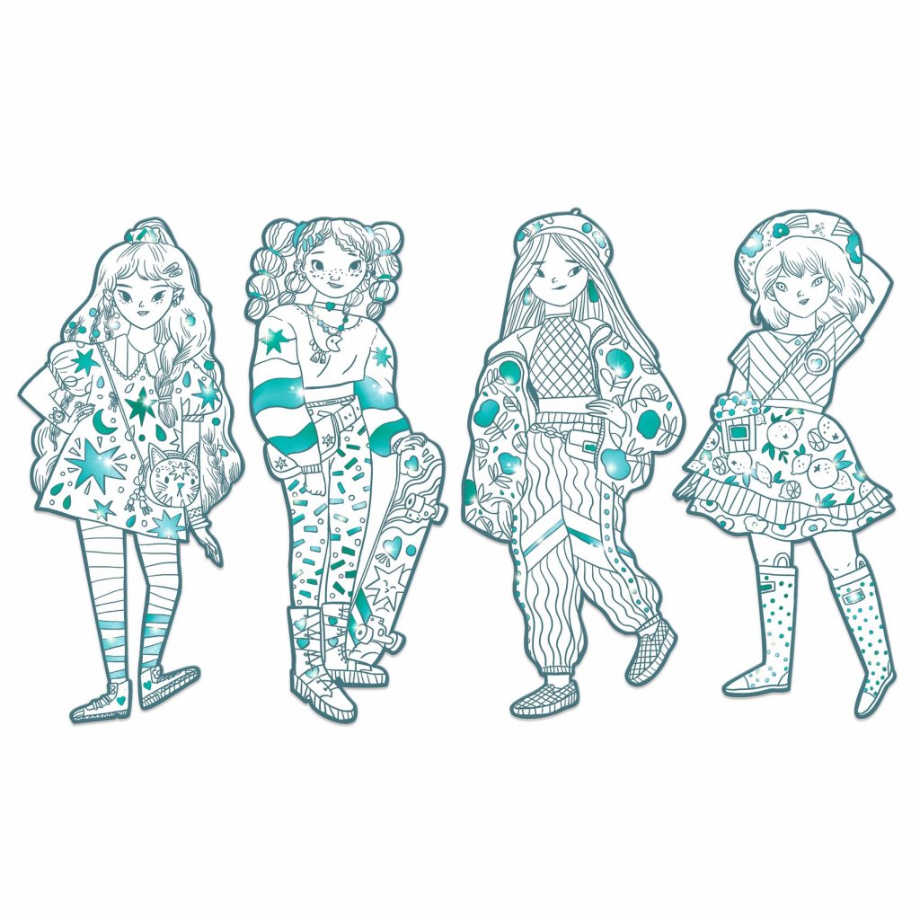 Přehlídka dívek se stylovým oblečení, které děti mohou vybarvit podle svých představ. Čtyři velké obrysy (32 cm vysoké) nabízejí oblečení pokryté vzory a zdobené lesklými plochami, aby modely vypadaly ještě lépe. Modelky jsou vyřezány z odolného, tvrdého kartonu, takže hotové výtvory dětem dlouho vydrží na hraní nebo jako dekorace. Obsah: 4 obrysy modelek k vybarvení, zdobené metalickými plochami.