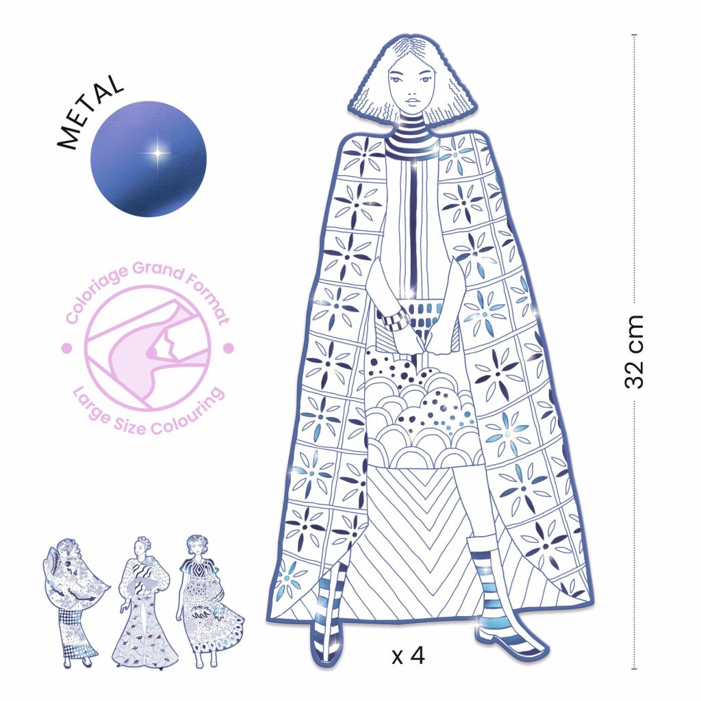Čtyři velké obrysy (32 cm vysoké) nabízejí oblečení pokryté vzory a zdobené lesklými plochami, aby modely vypadaly ještě lépe. Modelky jsou vyřezány z odolného, tvrdého kartonu, takže hotové výtvory dětem dlouho vydrží na hraní nebo jako dekorace.