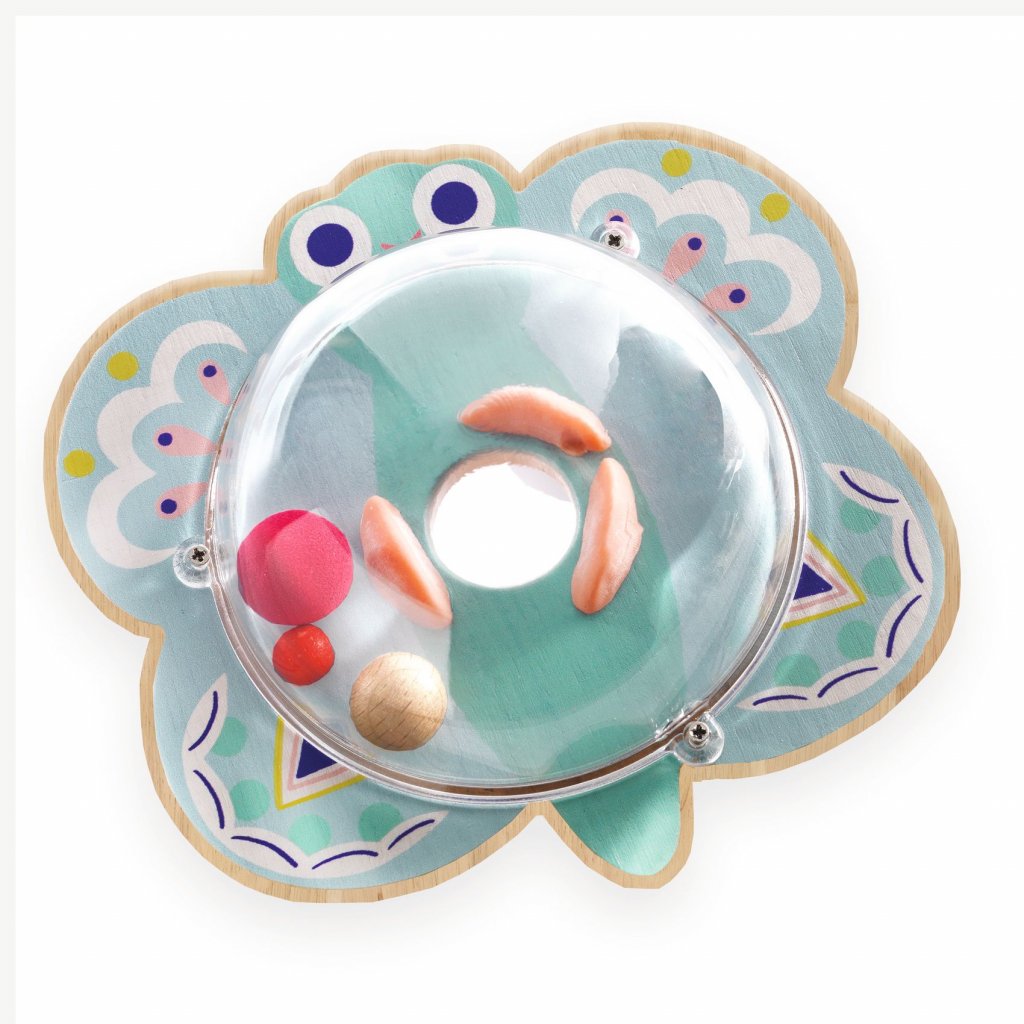 Hračka se na zemi houpe o otáčí a kuličky propadávají otvory do druhé půlky chrastítka. Děti procvičují jemnou motoriku.