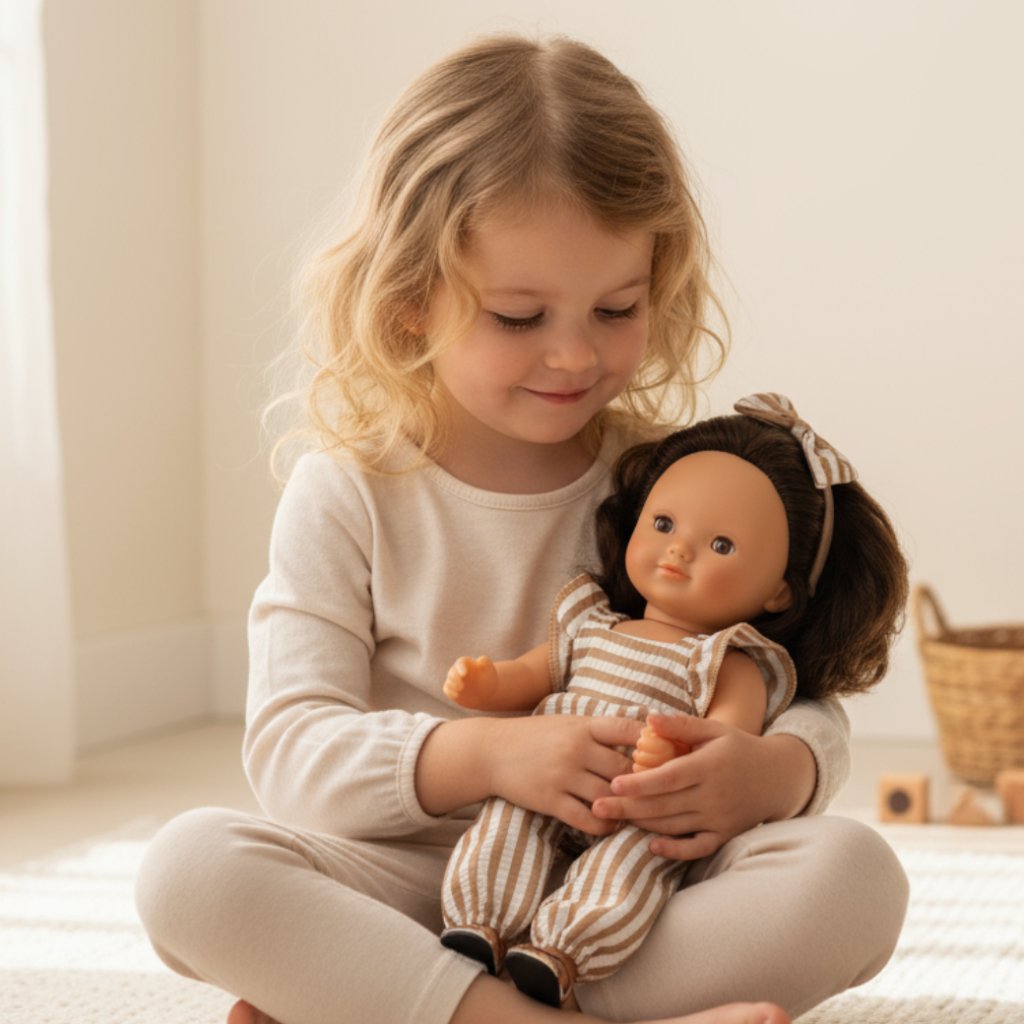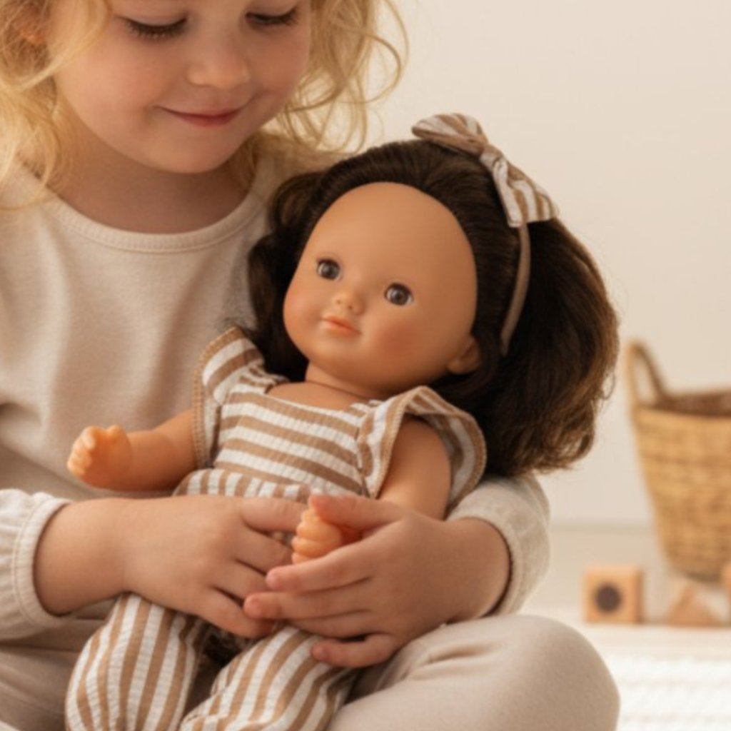 Rosalie je půvabná panenka vysoká 32 cm, která okouzlí svými hnědými vlasy i laskavým pohledem. Má měkké tělíčko z příjemného vinylu a zavírá oči, když si lehne. Díky krásnému letnímu overalu, čelence s mašlí a sandálkům je připravená na každé dobrodružství. Děti si s ní užijí spoustu příběhů, česání i oblékání.