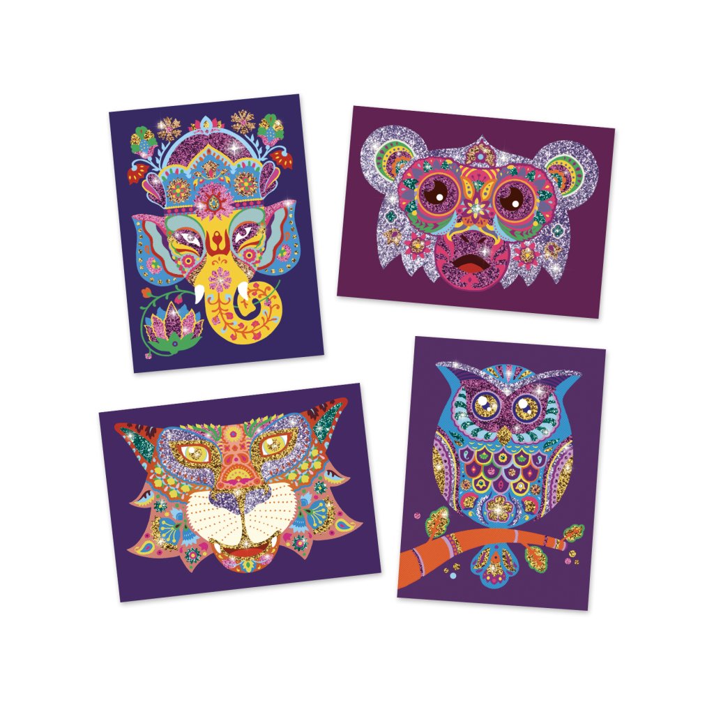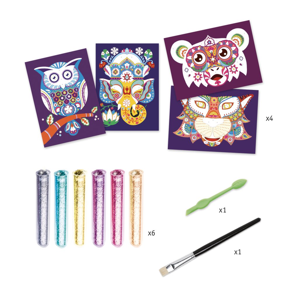 Děti podle návodu odstraní vyznačené plochy, které jsou samolepicí. Na tyto plochy poté nasypou barevné třpytky. Přebytečné třpytky se pak díky otvoru v rohu krabičky nasypou zpět do příslušné tubičky. Video jak na to:https://youtu.be/G5nObEpNZlI