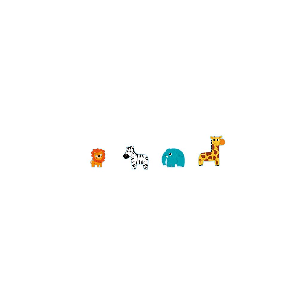 Barevné puzzle se zvířátky z džungle jsou ideální první skládačkou pro nejmenší děti. Obrázky jsou tvořené z 3–6 dílků, takže mohou začínat jednoduše a postupně si troufnout i na složitější varianty. Zábavnou formou se rozvíjí logické myšlení, soustředění i trpělivost.