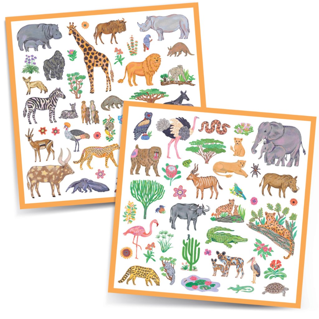 Samolepky zvířat, jako jsou lvi, zebry a sloni, až po méně známé tukany, bonga a watusi. Děti objeví bohatou rozmanitost africké flóry a fauny. Nalepujte samolepky, jak se vám zlíbí, a vytvořte si vlastní exotické výjevy nebo si vyzdobte vlastní kresby.