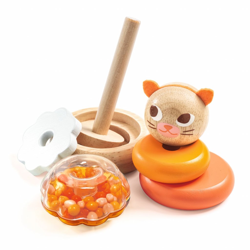 Obsah: 1 dřevěná vývojová skládací hračka: 1 kočičí hlava, 3 kroužky, 1 průhledný plastový kroužek s korálky uvnitř, 1 základna, 1 tyčka a 1 květina.