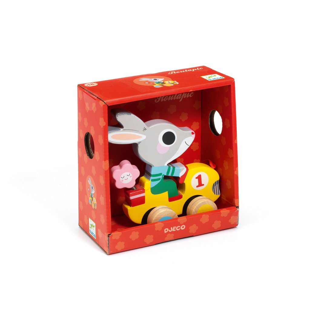 Stačí zatáhnout za šňůrku a barevné auto se zajíčkem uhání vpřed. Hračka motivuje děti k pohybu, rozvíjí motoriku a přináší spoustu zábavy při prvních krůčcích.