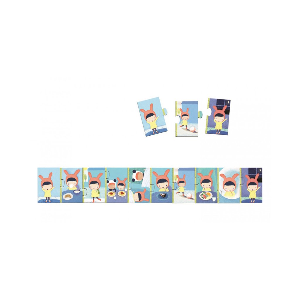 Zábavné puzzle, se kterým se děti učí správnou posloupnost každodenních činností. Skládáním se rozvíjí nejen jemná motorika, ale i představivost a schopnost vyprávět vlastní příběhy.