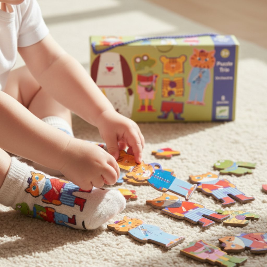 Hra, která je zábavná a jednoduchá na hraní. Pomáhá rozvíjet pozorovací schopnosti a jemnou motoriku. Silné kartonové dílky puzzle se snadno uchopují. Barevná krabička, která je zábavná a snadno se přenáší díky provázku. Vyrobeno z papíru a lepenky s certifikací FSC®.