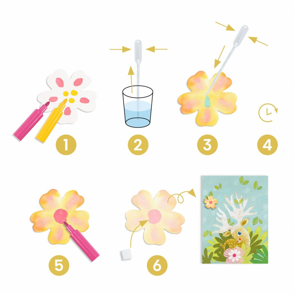 Odtrhněte tvar ze savého papíru a položte jej na savý papír. Udělejte perem několik teček a přidejte kapku vody pomocí pipety: Inkoust se začne rozlévat... Výsledky jsou neuvěřitelné! Jakmile kresba zaschne, přilepte ji oboustrannou lepicí páskou na ilustrovaná pozadí a ozdobte si svůj pokoj.