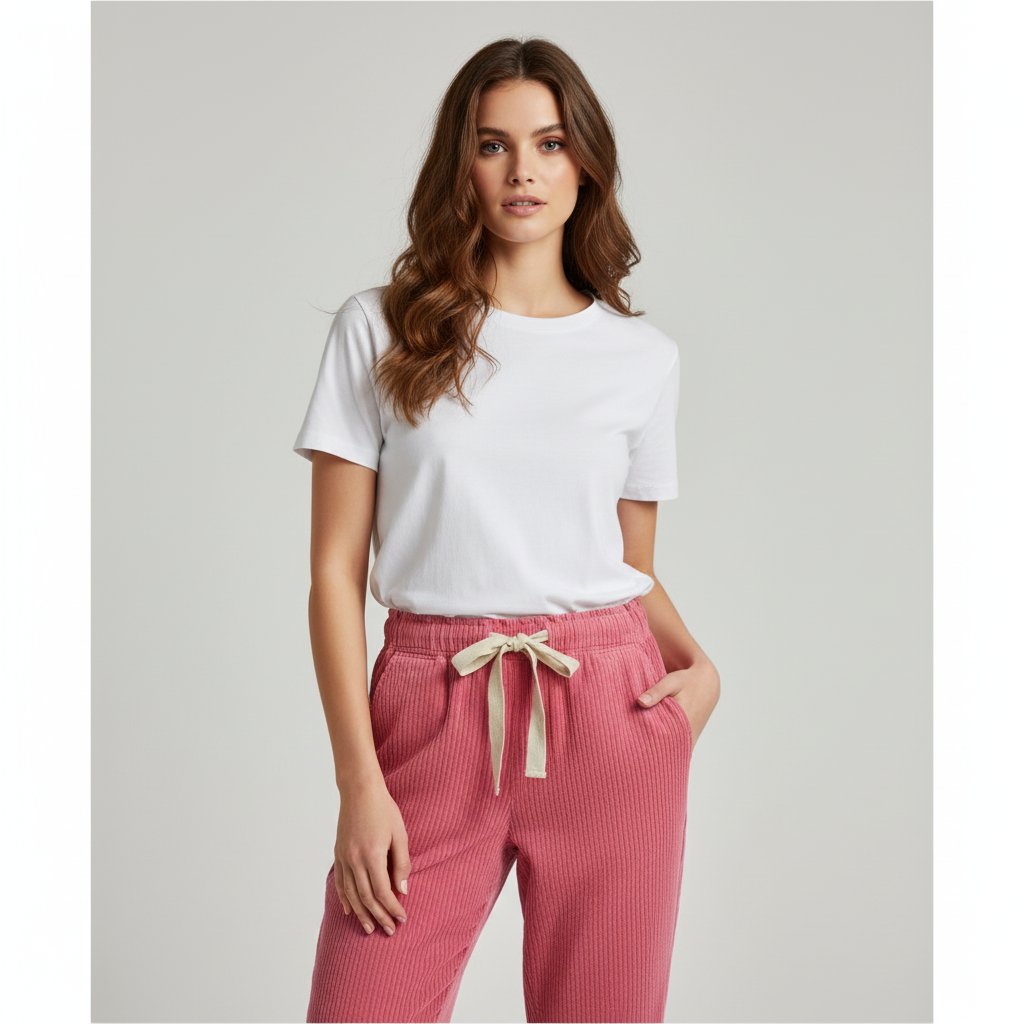 Stylové kalhoty z hrubě žebrovaného bavlněného manšestru, které se pohybují mezi mrkvovým střihem a ležérním „jogger“ efektem. Pohodlný vysoký pas s elastickým zpracováním a praktické kapsy z nich dělají ideální kousek pro každodenní nošení. Kalhoty jsou zakončeny záhyby u kotníků, což jim dodává originální a moderní siluetu.