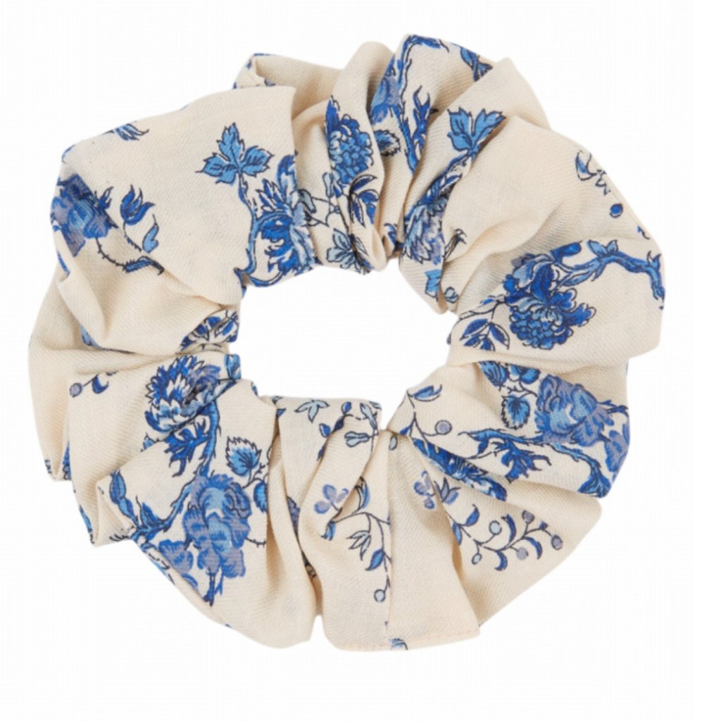 Stylová gumička do vlasů (scrunchie) ušitá z měkkého bavlněného flanelu v odstínu ecru, zdobená drobným vzorem modrých květů. Lze ji nosit klasicky ve vlasech nebo i jako náramek na zápěstí – vždy dokonale doladí váš outfit.