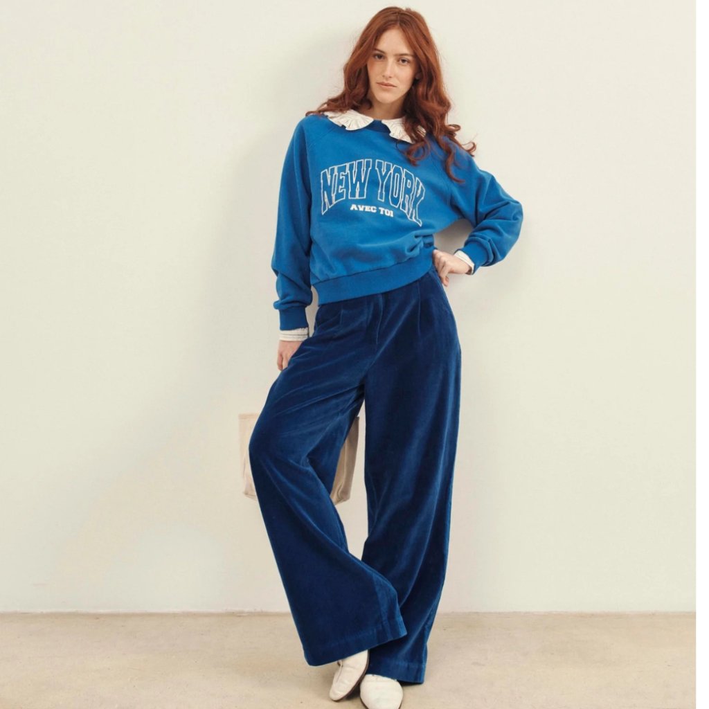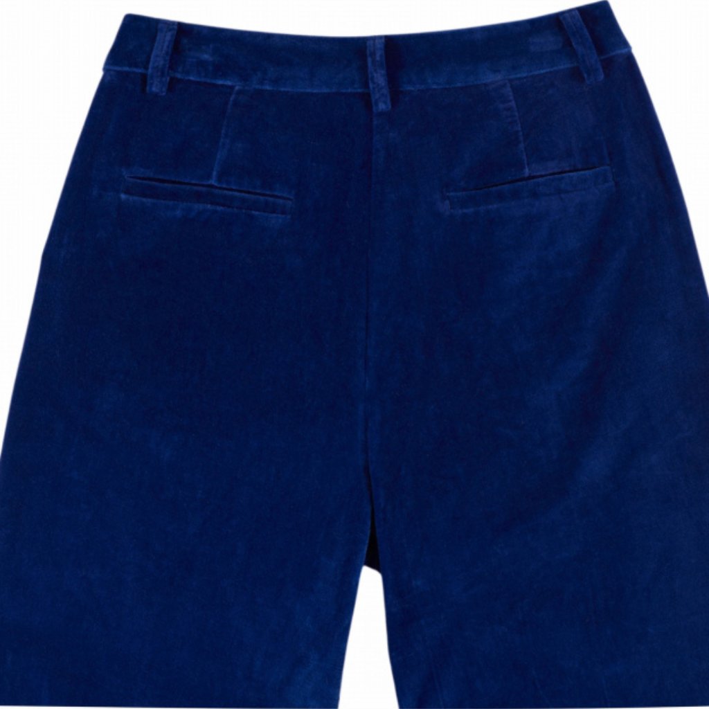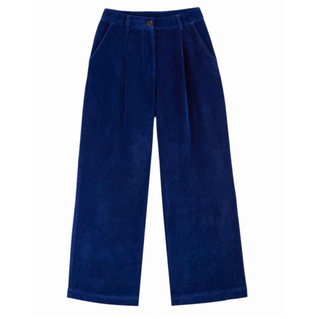 Stylové kalhoty z bavlněného sametu v královské modři s pohodlným a elegantním střihem. Díky širokému střihu a vysokému pasu vytvářejí moderní a lichotivý siluetu vhodnou pro každodenní nošení i slavnostní příležitosti.