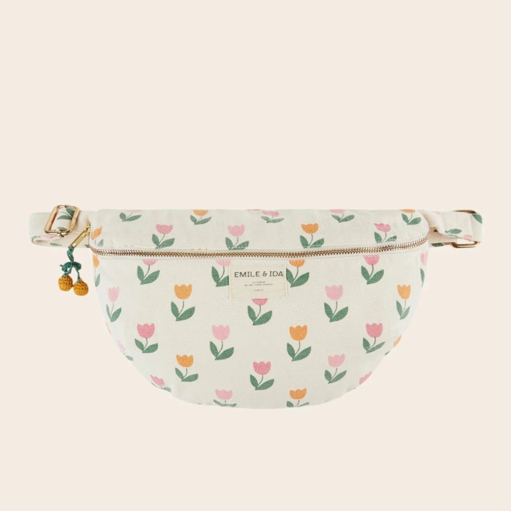 Belt bag z bavlněného plátna s jemným tulipánovým vzorem je ideální doplněk pro každodenní nošení. Můžete ji nosit crossbody nebo připnout kolem pasu – vždy budete mít vše důležité po ruce.