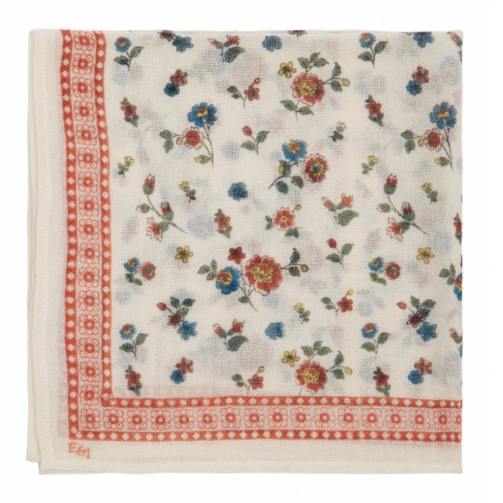 Elegantní vlněný šátek v jemném odstínu ecru, zdobený potiskem pestrobarevných květin. Univerzální doplněk, který můžete nosit kolem krku, uvázaný v pase, nebo do vlasů ve stylu hvězd 50. let. Šátek, který se přizpůsobí každé náladě i příležitosti.