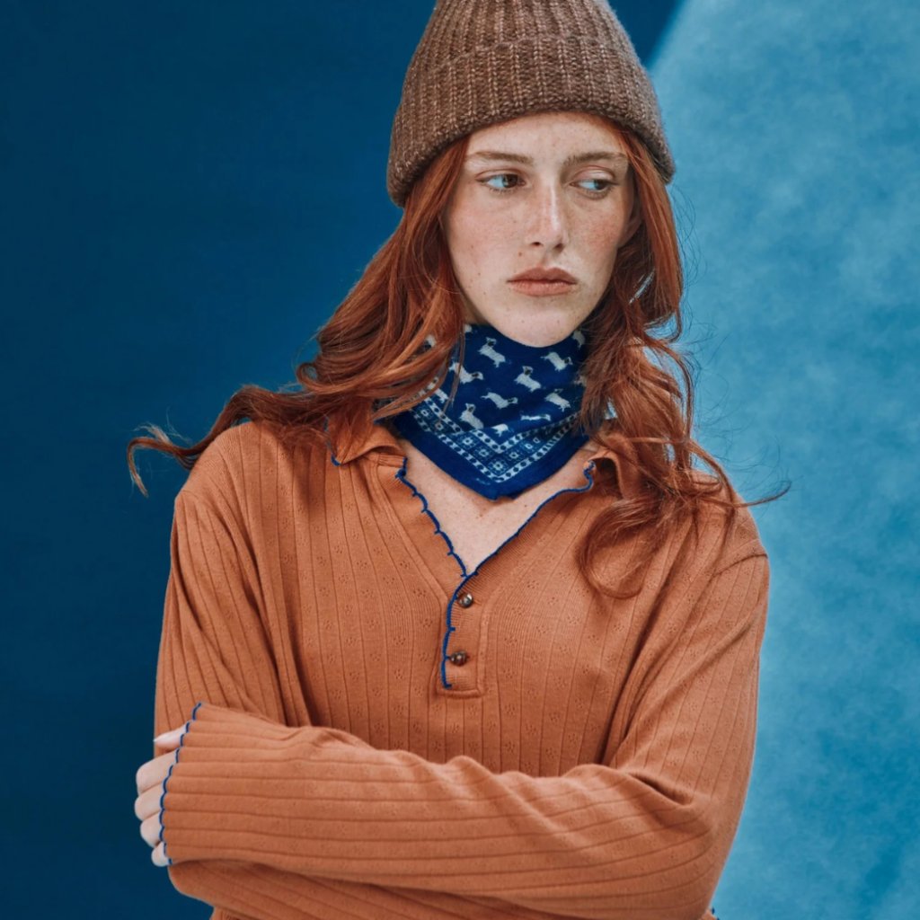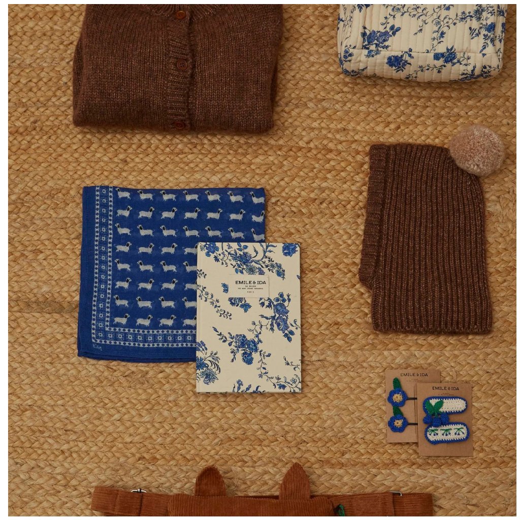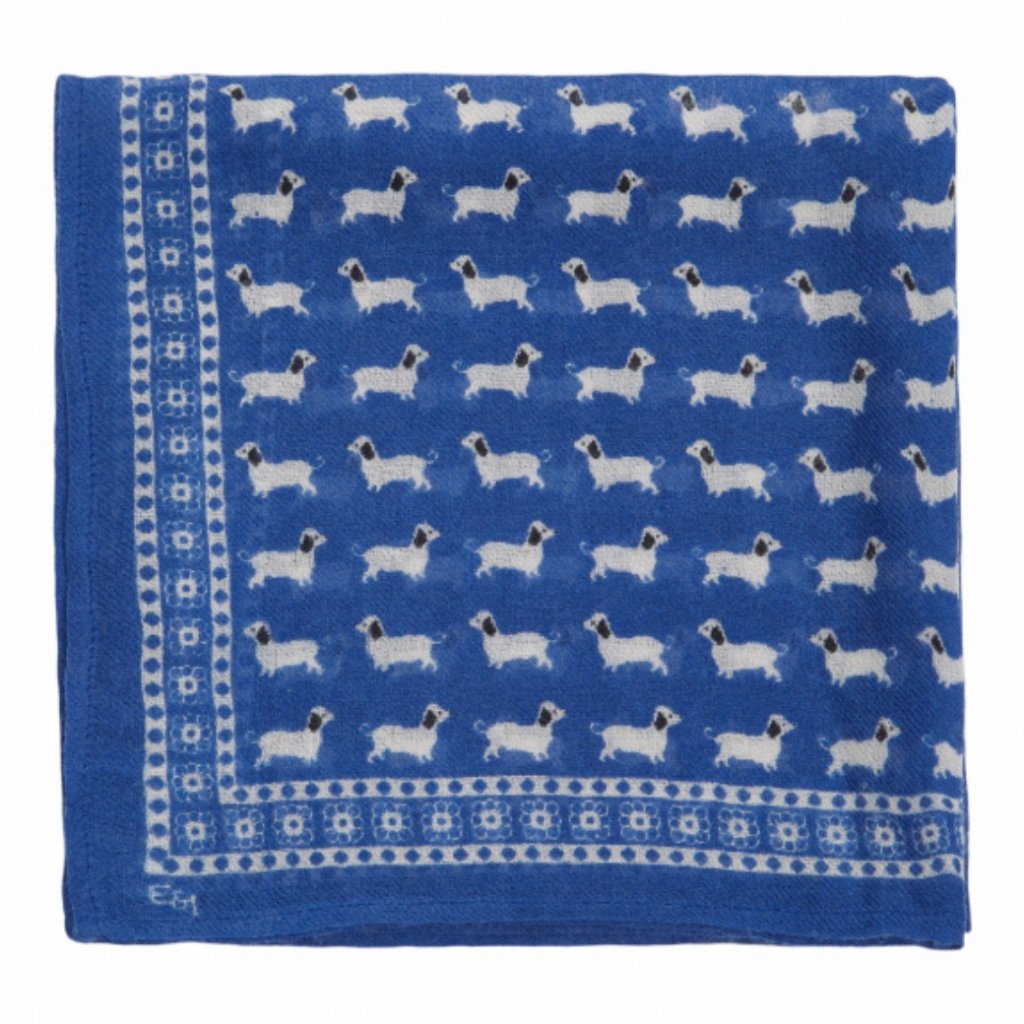 Originální vlněný šátek v odstínu francouzské modré, zdobený veselým potiskem ecru jezevčíků. Díky své univerzálnosti jej můžete nosit klasicky kolem krku, uvázaný v pase nebo jako doplněk do vlasů ve stylu hvězd 50. let. Perfektní módní detail, který doladí každý outfit a přizpůsobí se vaší náladě