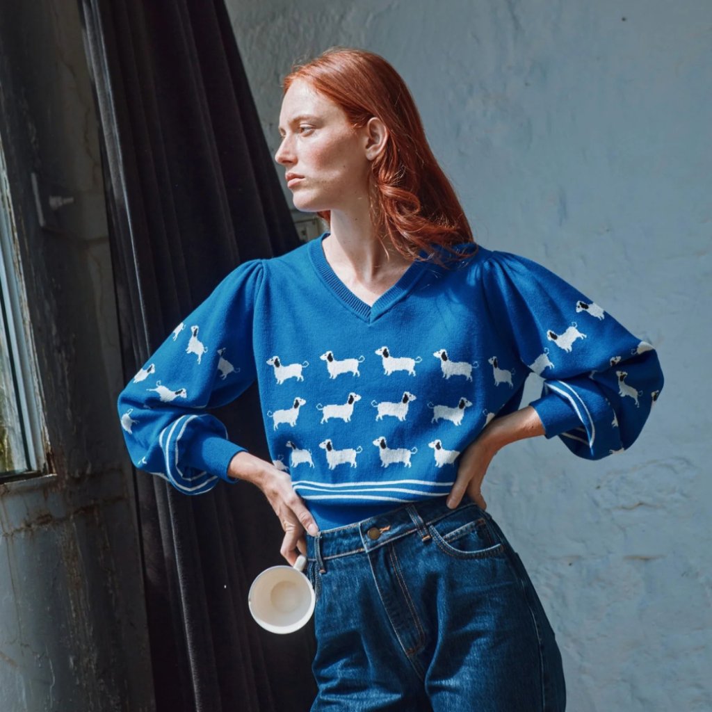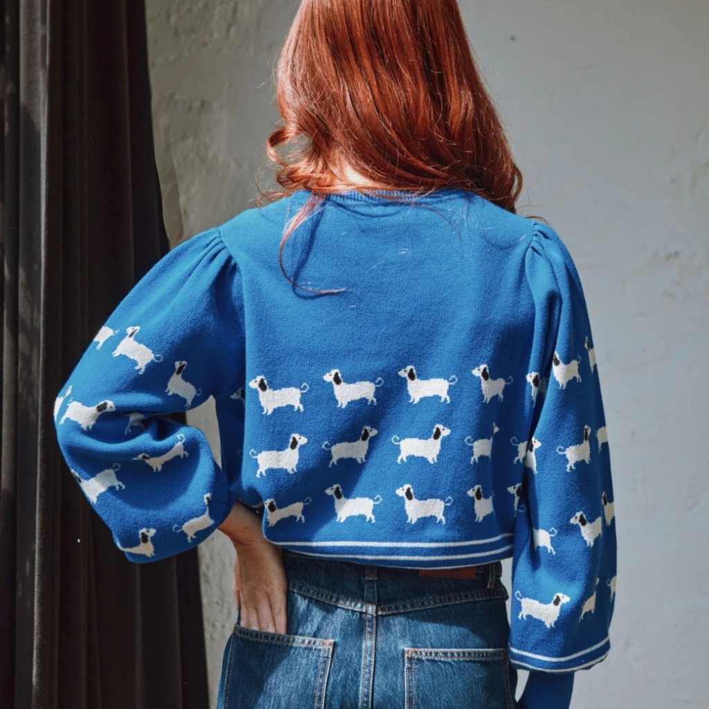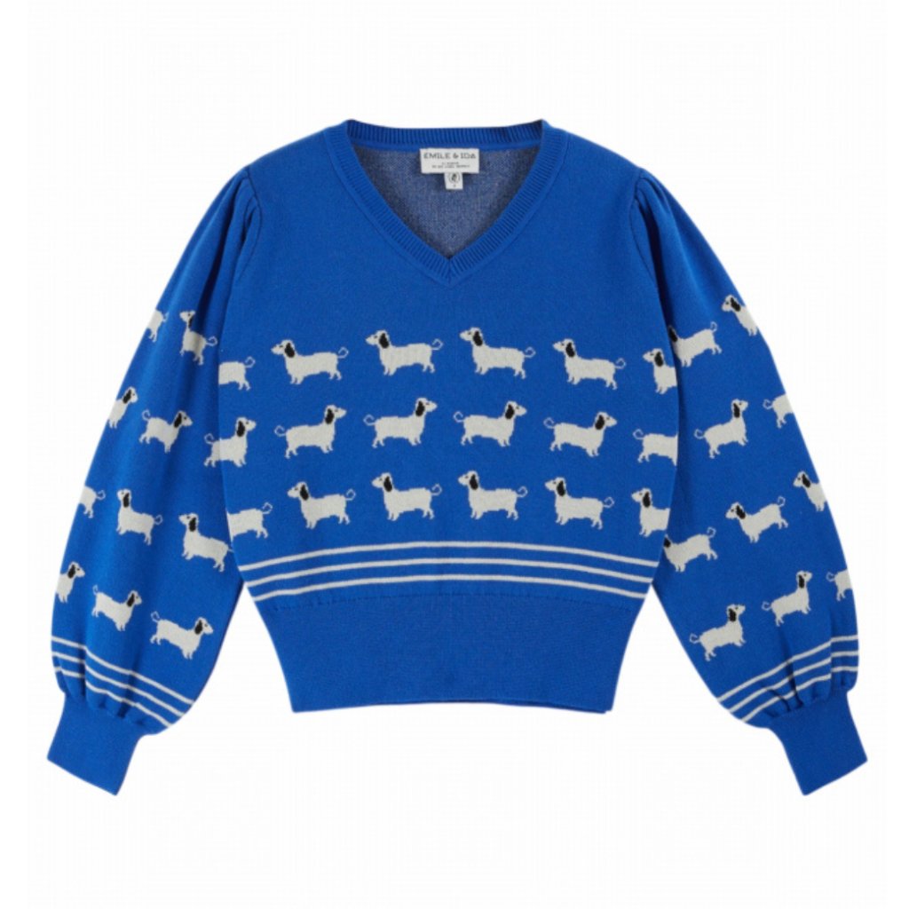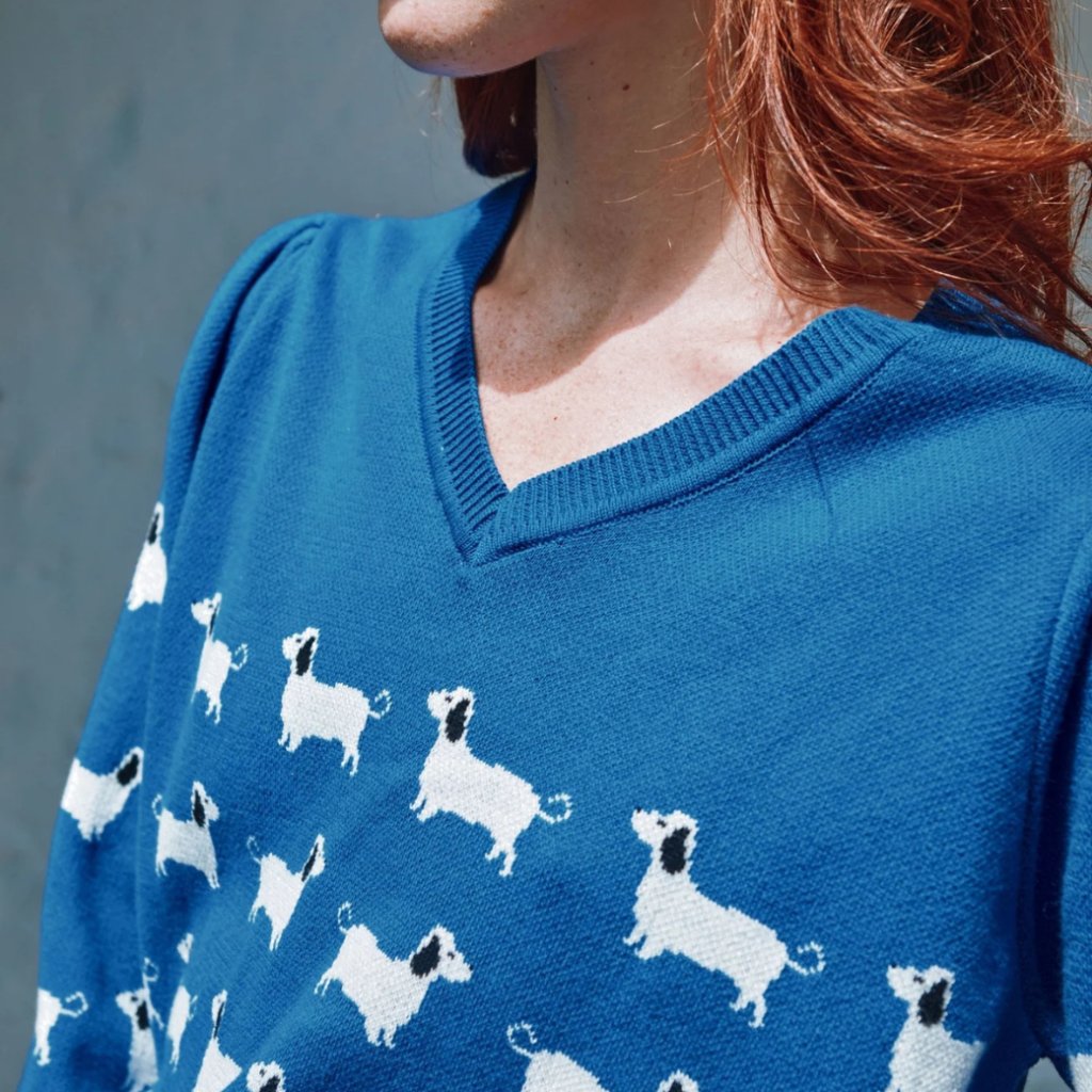 Roztomilý pletený svetr z organické bavlny v královské modři, ozdobený bílými jezevčíky. Pletený technikou intarsia jacquard, která dodává vzoru precizní detail a trvanlivost. Svetr je měkký a hřejivý, ideální pro pohodlí během chladných zimních dní.