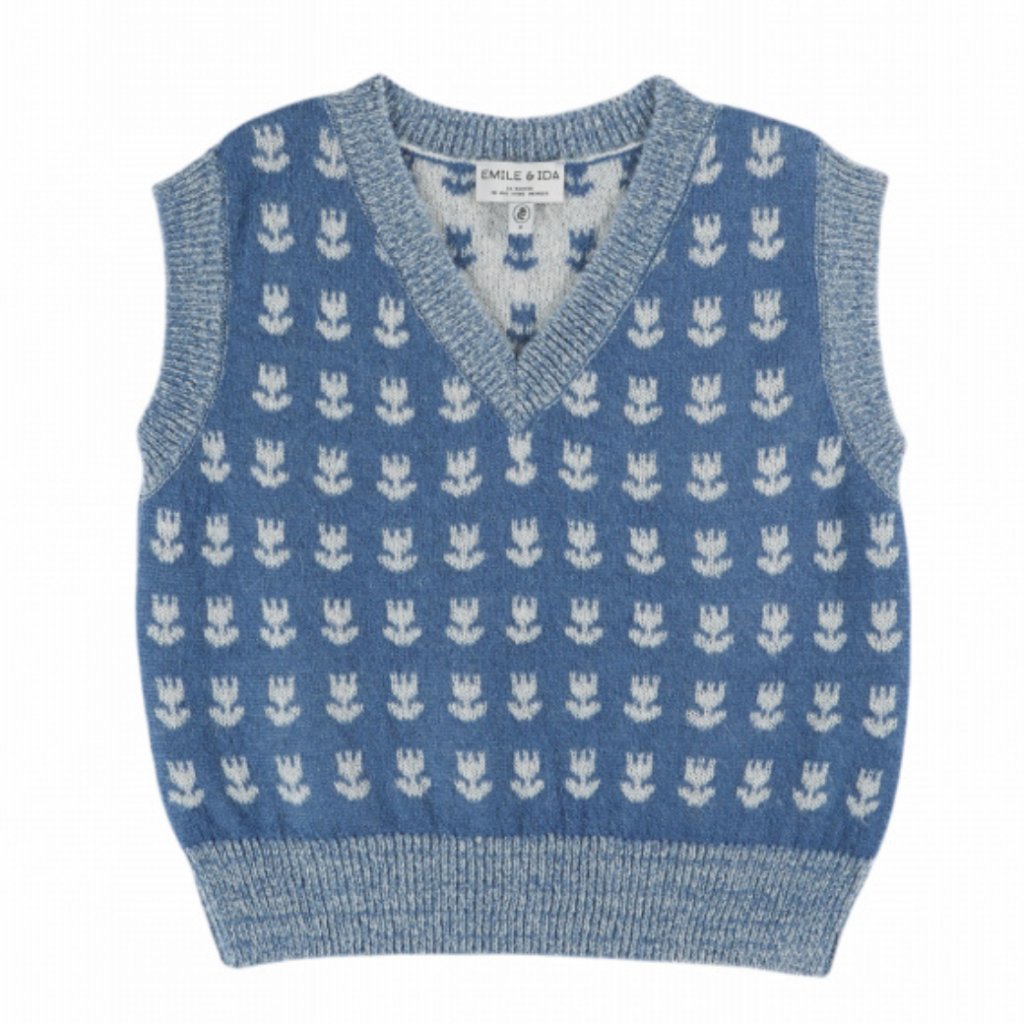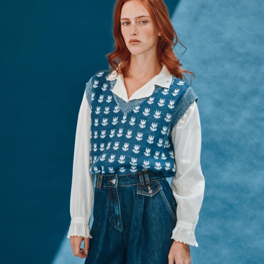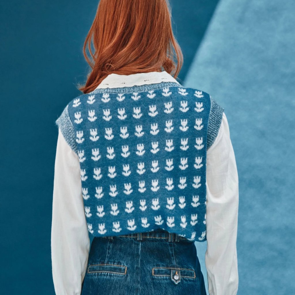 Elegantní modrý svetr bez rukávů z měkké směsi ovčí vlny. Přední i zadní stranu zdobí řady bílých tulipánů, dokonale uspořádaných jako v tradiční francouzské zahradě. Stylový kousek, který dodá vašemu outfitu originalitu a hřejivost.