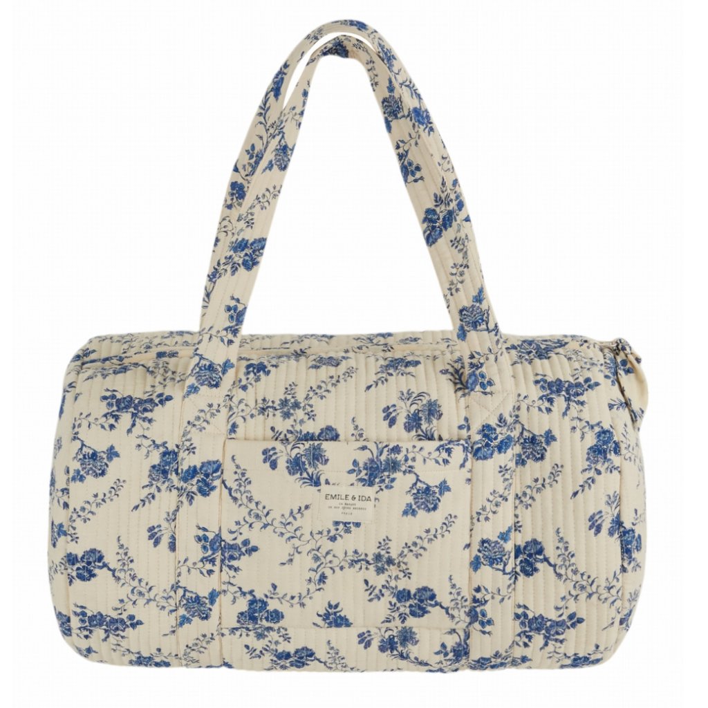 Stylová cestovní taška z pevné ecru bavlny, zdobená jemným květinovým vzorem v modré barvě. Praktická velikost a promyšlené detaily z ní dělají ideálního společníka na víkendové pobyty, dovolené i kratší výlety. Díky prostornému vnitřku a kapsám budete mít své věci vždy přehledně uspořádané.