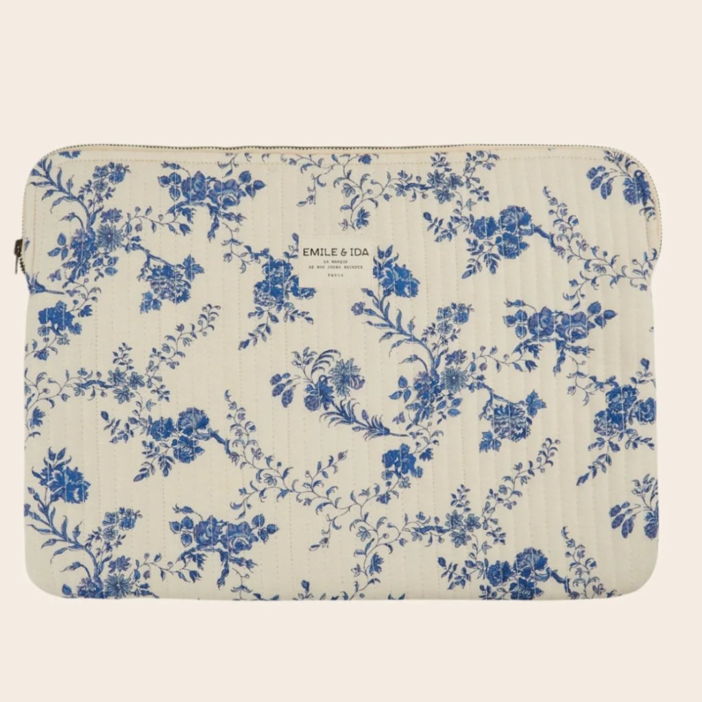 Stylové a funkční pouzdro na notebook, ušité z měkkého bavlněného fleecu v odstínu off-white a ozdobené jemným květinovým potiskem v modré barvě. Na jedné straně najdete decentní výšivku „Mon Amour“ v ledově hnědém tónu, která dodává pouzdru romantický nádech. Praktický prošívaný design a polstrování zajistí bezpečí vašeho zařízení.