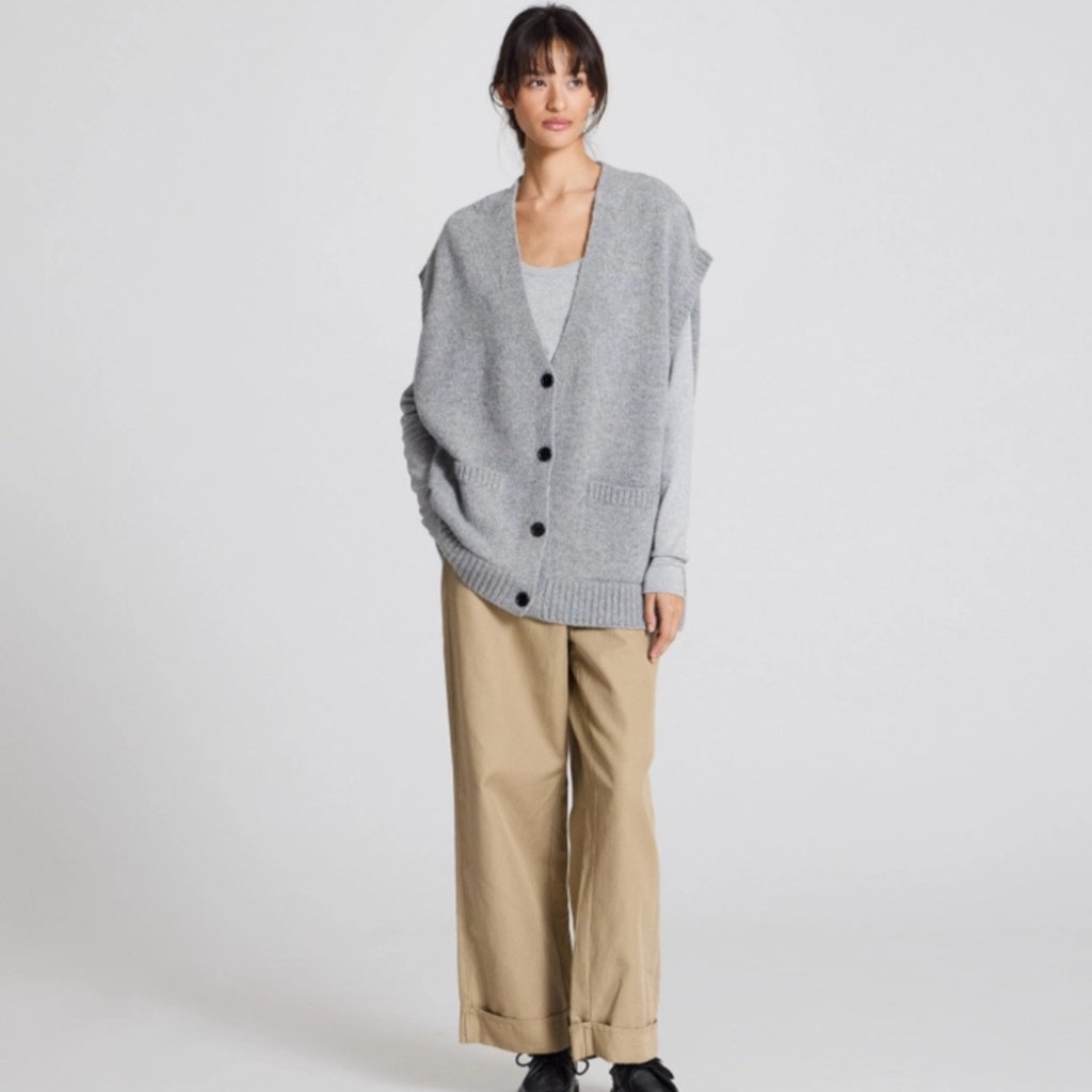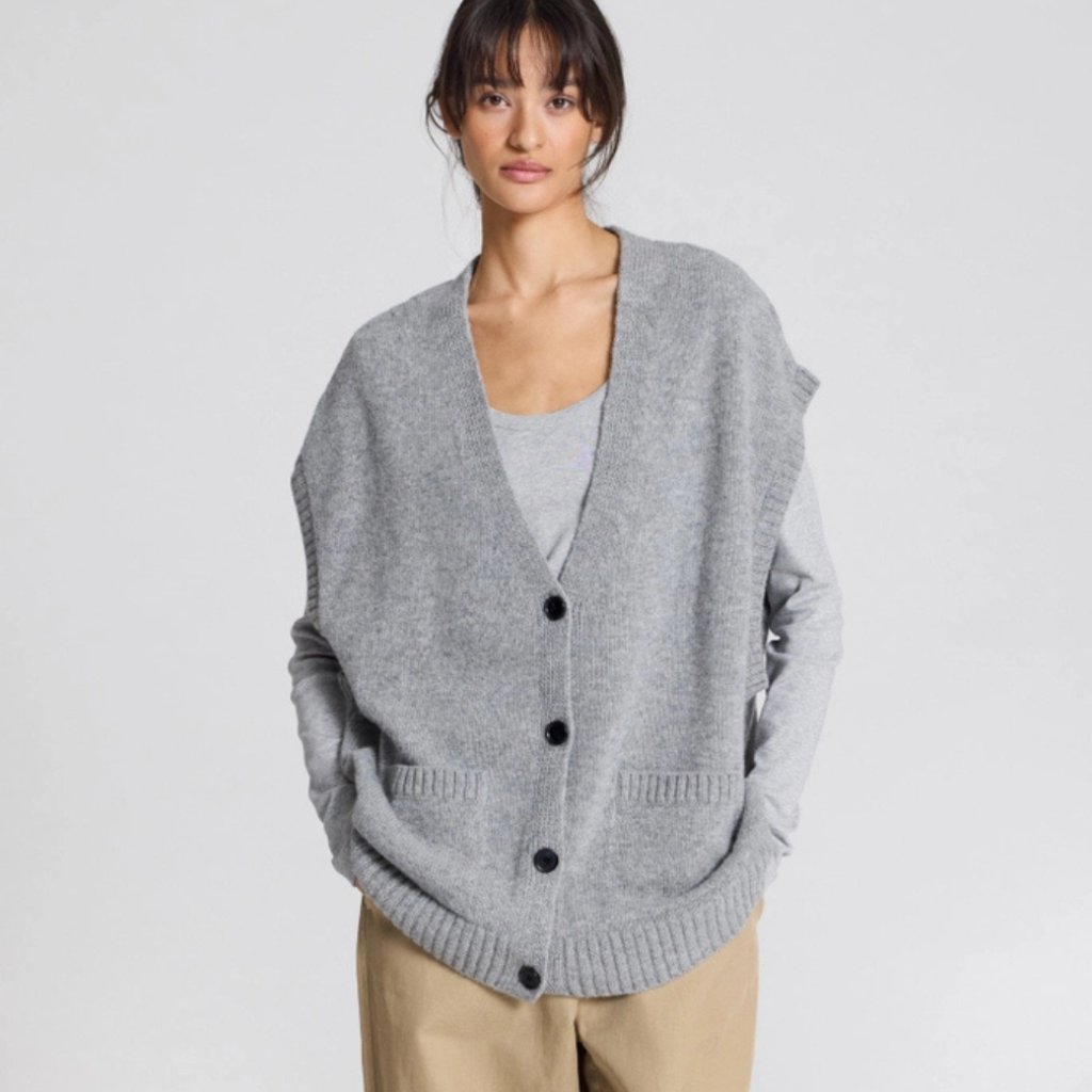 Thea je pletená vesta na knoflíky, vyrobená ze 100% jehněčí vlny. Má véčkový výstřih, žebrované lemy a knoflíky z rohoviny. Díky oversize střihu působí uvolněně a snadno se vrství přes košile či trička.