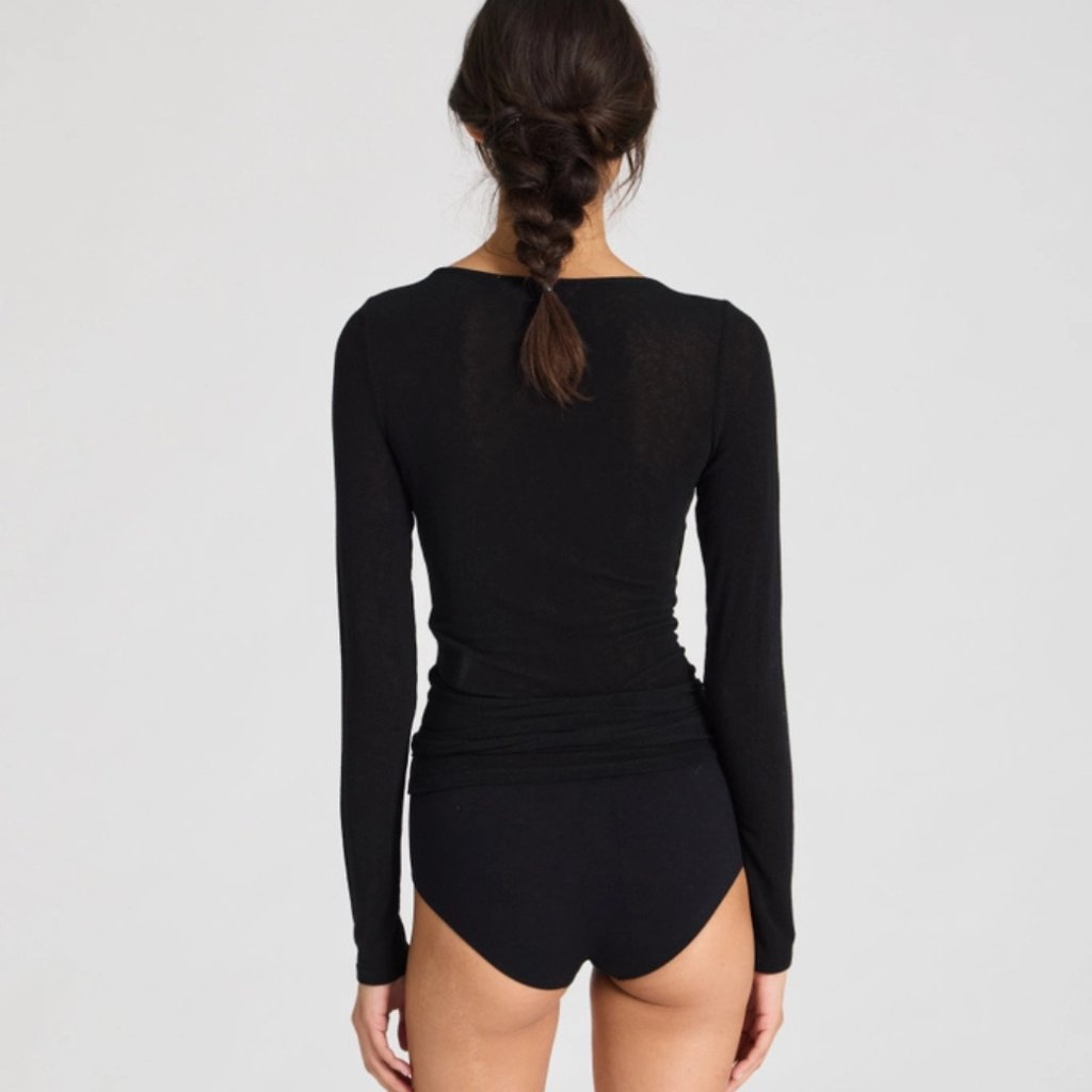 Anne Top je krásné, měkké tričko s dlouhým rukávem a zavinovacím střihem, vyrobené z jemné směsi 67 % viskózy, 28 % vlny a 5 % elastanu. Díky italské tenké pletenině z vlny a viskózy působí elegantně, příjemně se nosí a snadno se přizpůsobí postavě pomocí zavazovacích šňůrek.